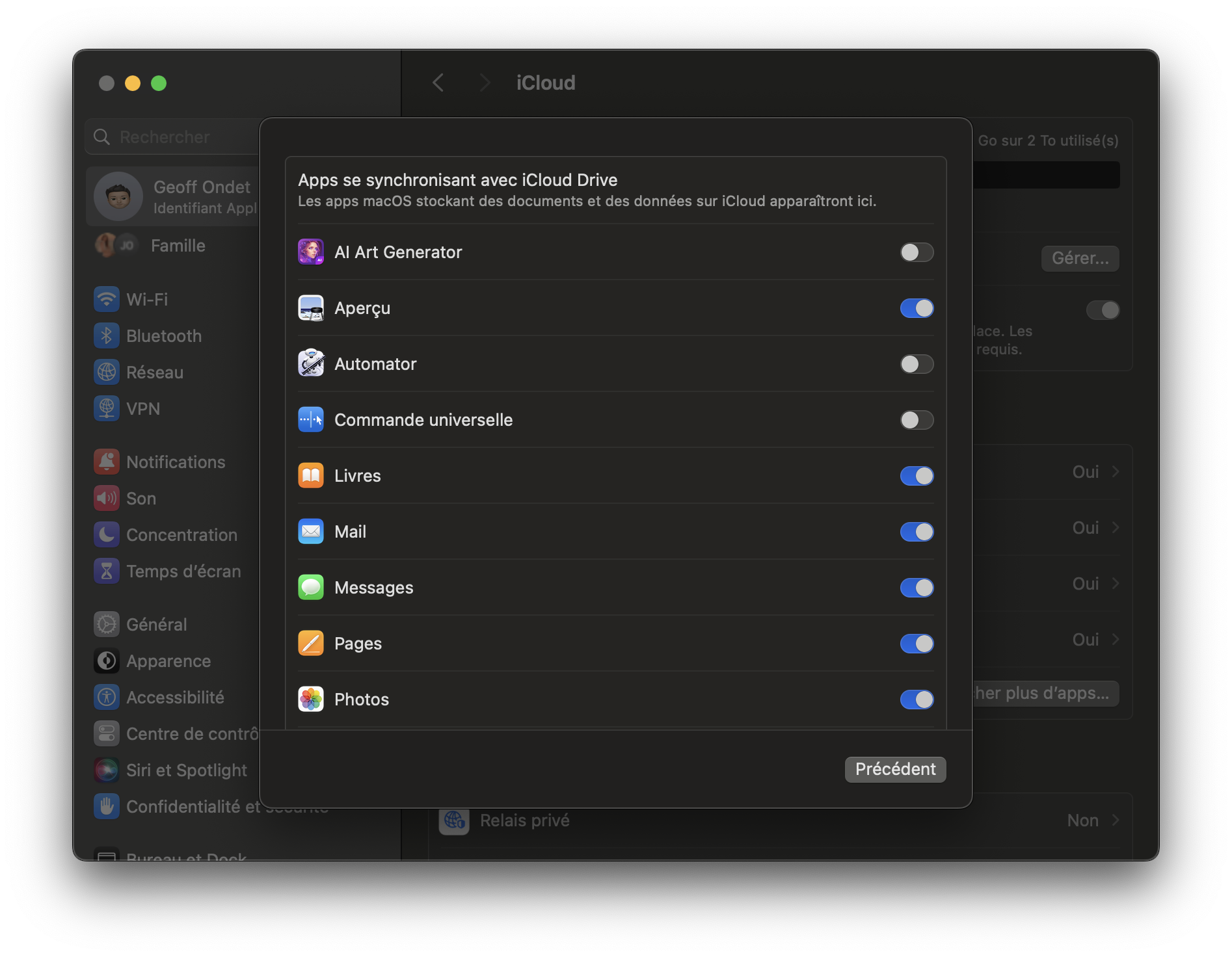 Sur macOS, en plus d’activer l’option Synchroniser ce Mac, activez l’option Bureau et documents pour synchroniser tous les fichiers qui se trouvent sur votre bureau macOS et dans votre répertoire Documents, sur le Cloud. Entrez ensuite dans Apps se synchronisant avec iCloud Drive, et sélectionnez toutes les applications pour lesquels vous souhaitez que les documents des données qu’elles génèrent soient synchronisées sur le Cloud.