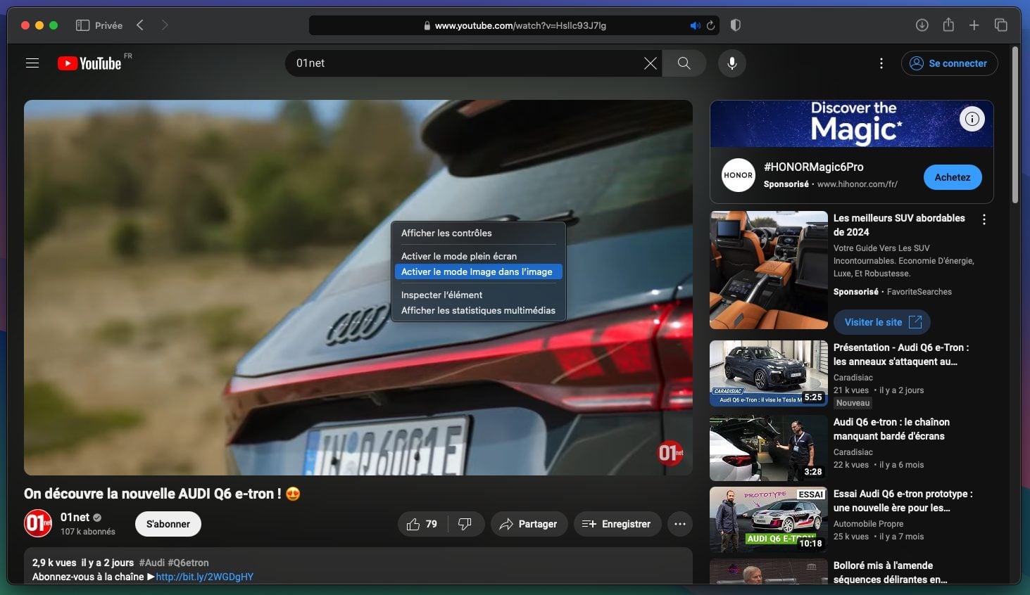 Pour ce faire, pendant la lecture d’une vidéo, faites un premier clic droit sur la vidéo, puis un second clic droit en décalant légèrement le curseur de la souris. Dans le menu contextuel qui s’affiche, choisissez Mode PiP (Picture-in-Picture).