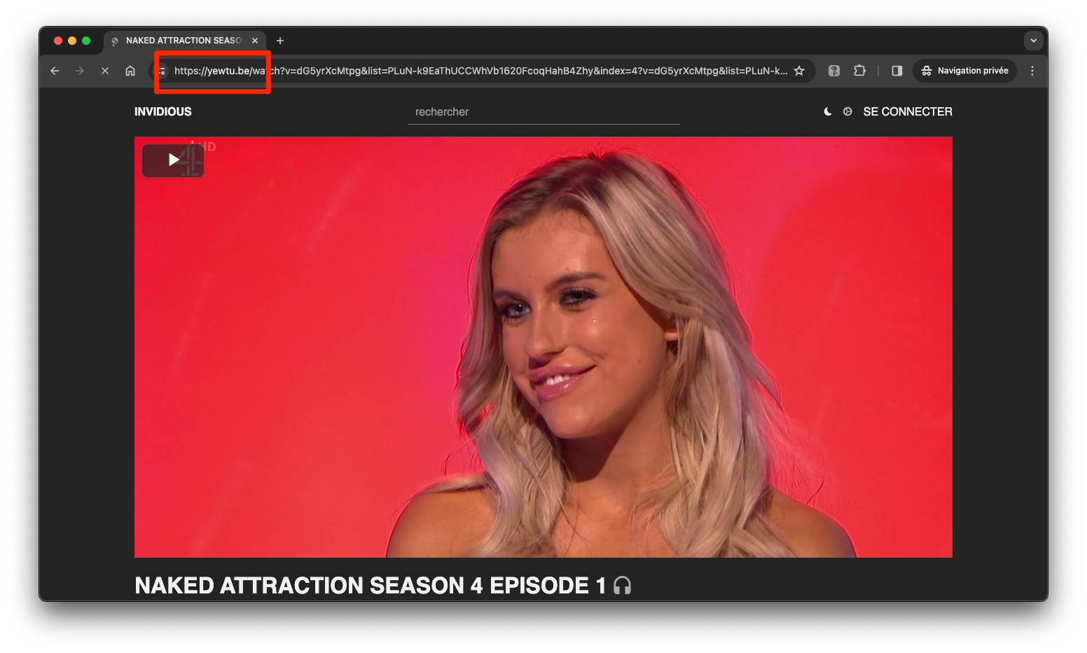 Il est pourtant possible d’outrepasser cette limite en modifiant l’URL de la vidéo. Pour ce faire, remplacez la partie youtube.com par yewtu.be. La page sera automatiquement redirigée vers un service tiers capable de lire les contenus de YouTube sans restriction.