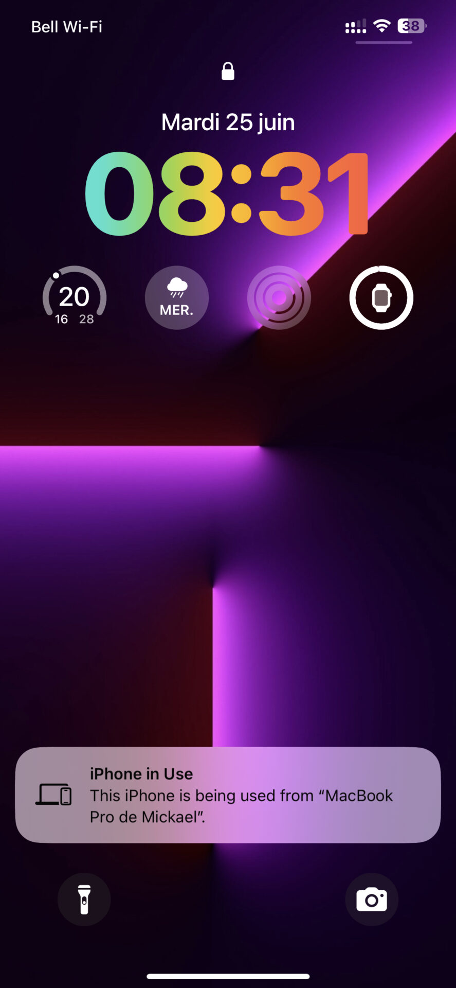 Apple a néanmoins ajouté deux boutons dans l’interface escamotable : une pour revenir à l’écran d’accueil, l’autre pour afficher l’écran multitâche. Même si l’iPhone est en veille à côté du Mac, les notifications reçues sur le smartphone s’afficheront tout de même sur l’écran du Mac — en cliquant sur l’alerte, c’est l’app iOS qui s’ouvrira. Dès que l’iPhone sort de veille, la recopie s’arrête (et une notification apparait sur l’iPhone, voir ci-dessous) ; elle ne reprendra que lorsque le smartphone est de nouveau verrouillé.