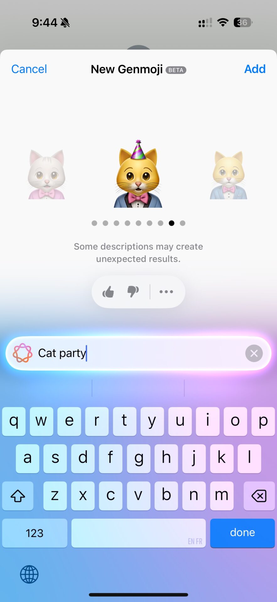 Le principe est assez simple. Un nouveau bouton Genmoji apparait dans le tiroir aux emojis ; il donne accès à la requête texte, dans laquelle on décrira l’image à créer. Apple Intelligence va combiner des emojis existants en fonction du prompt. Si la requête ne correspond à aucun emoji disponible, par exemple : « chat avec drapeau breton », l’app va suggérer des combinaisons d’emojis qui s’en rapprochent (un chat avec plusieurs sortes de drapeaux, le breton n’existant pas en version emojie).