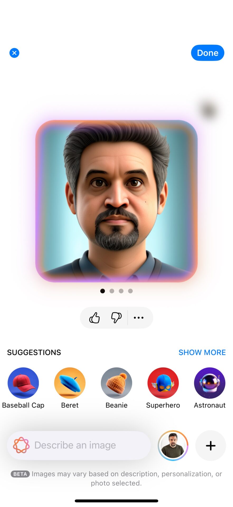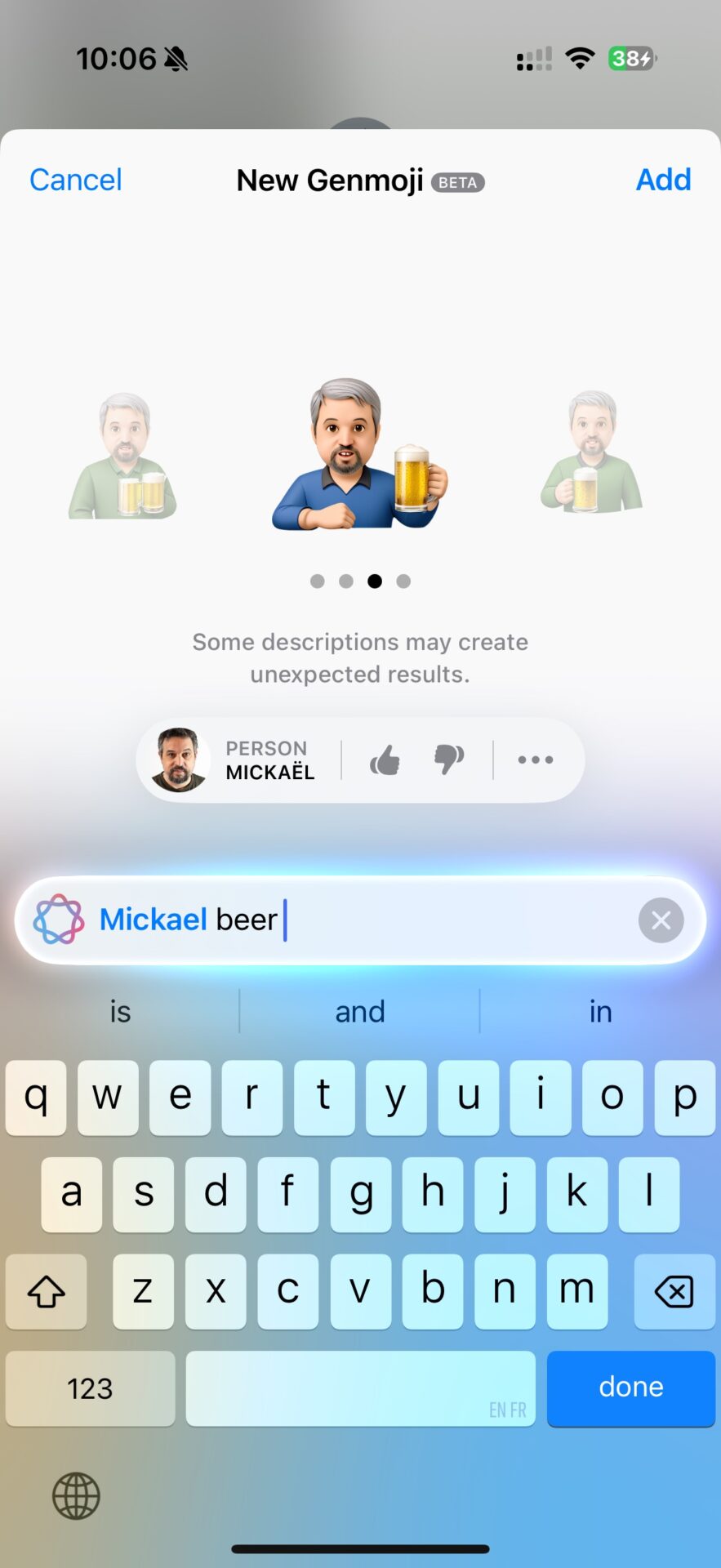 Il est même possible d’aller au-delà des emojis : pourquoi ne pas intégrer votre propre image sous la forme d’un emoji ? Les Genmoji peuvent générer une version « emoji » de l’utilisateur ou de n’importe quel correspondant, pour autant qu’il en existe une photo dans la photothèque. Dans le même ordre d’idée, il est possible de mixer un Memoji dans un Genmoji (tout le monde suit ?).
