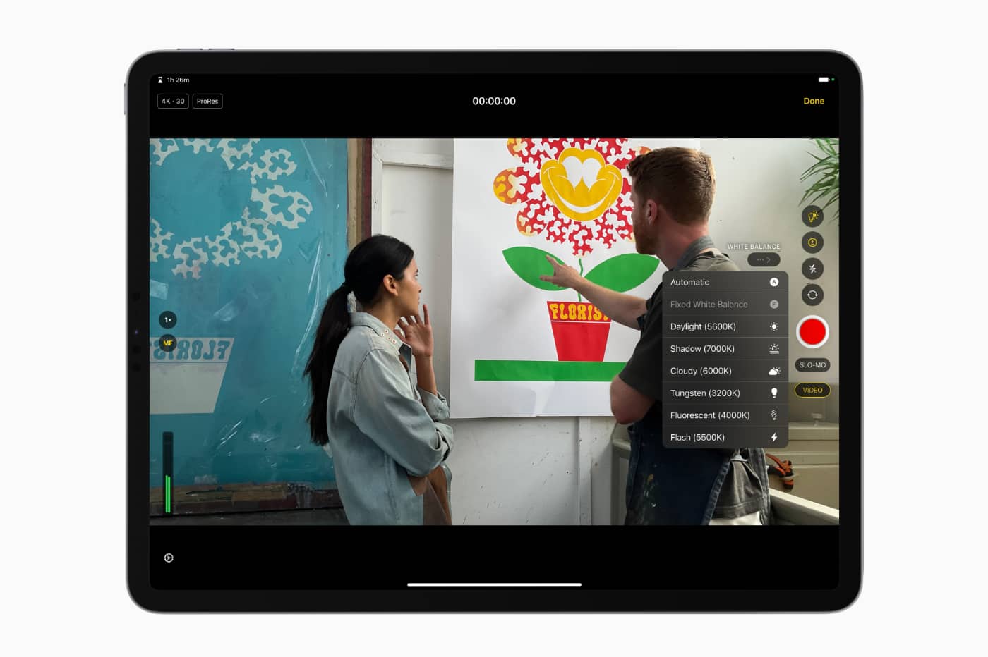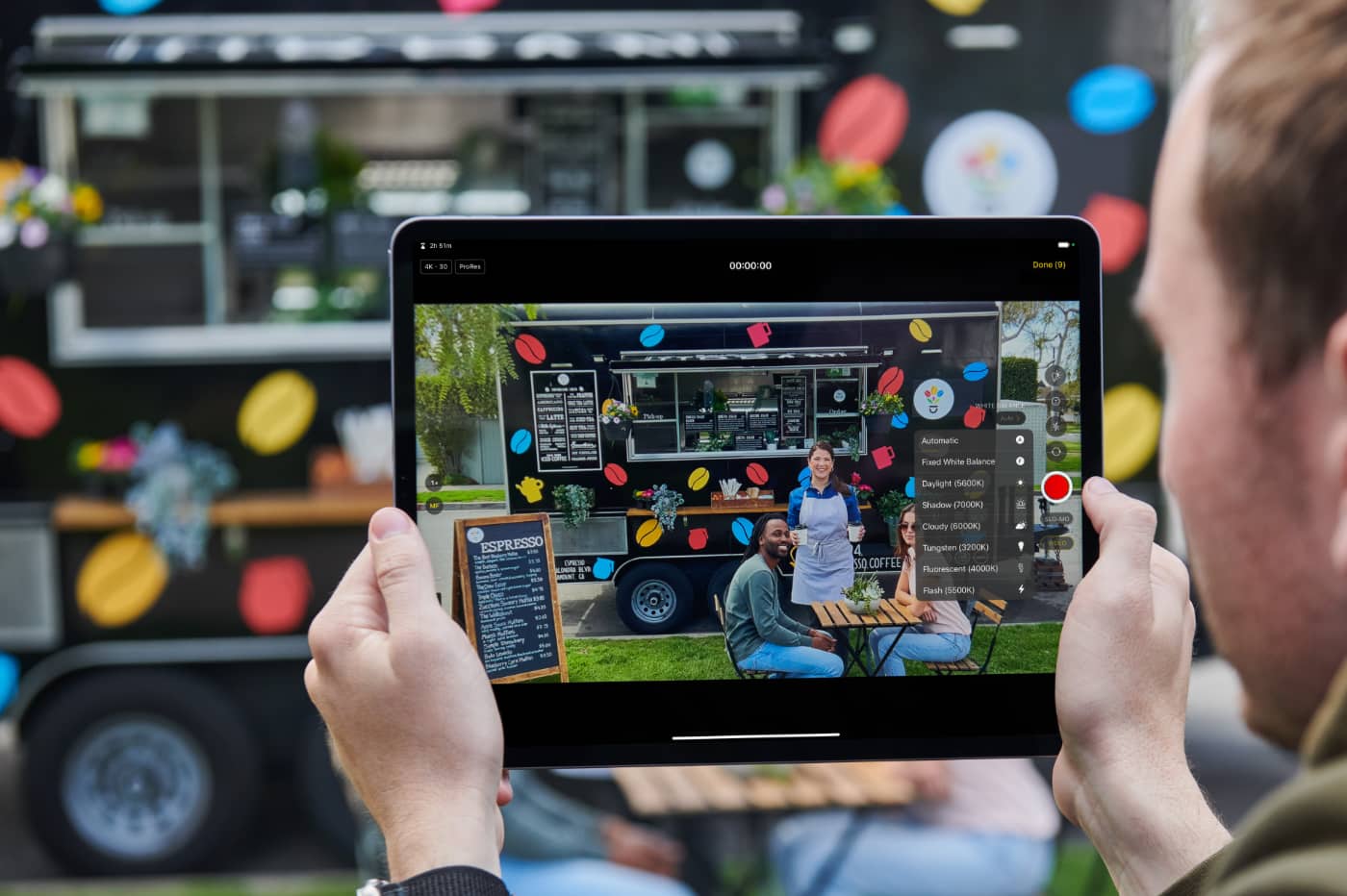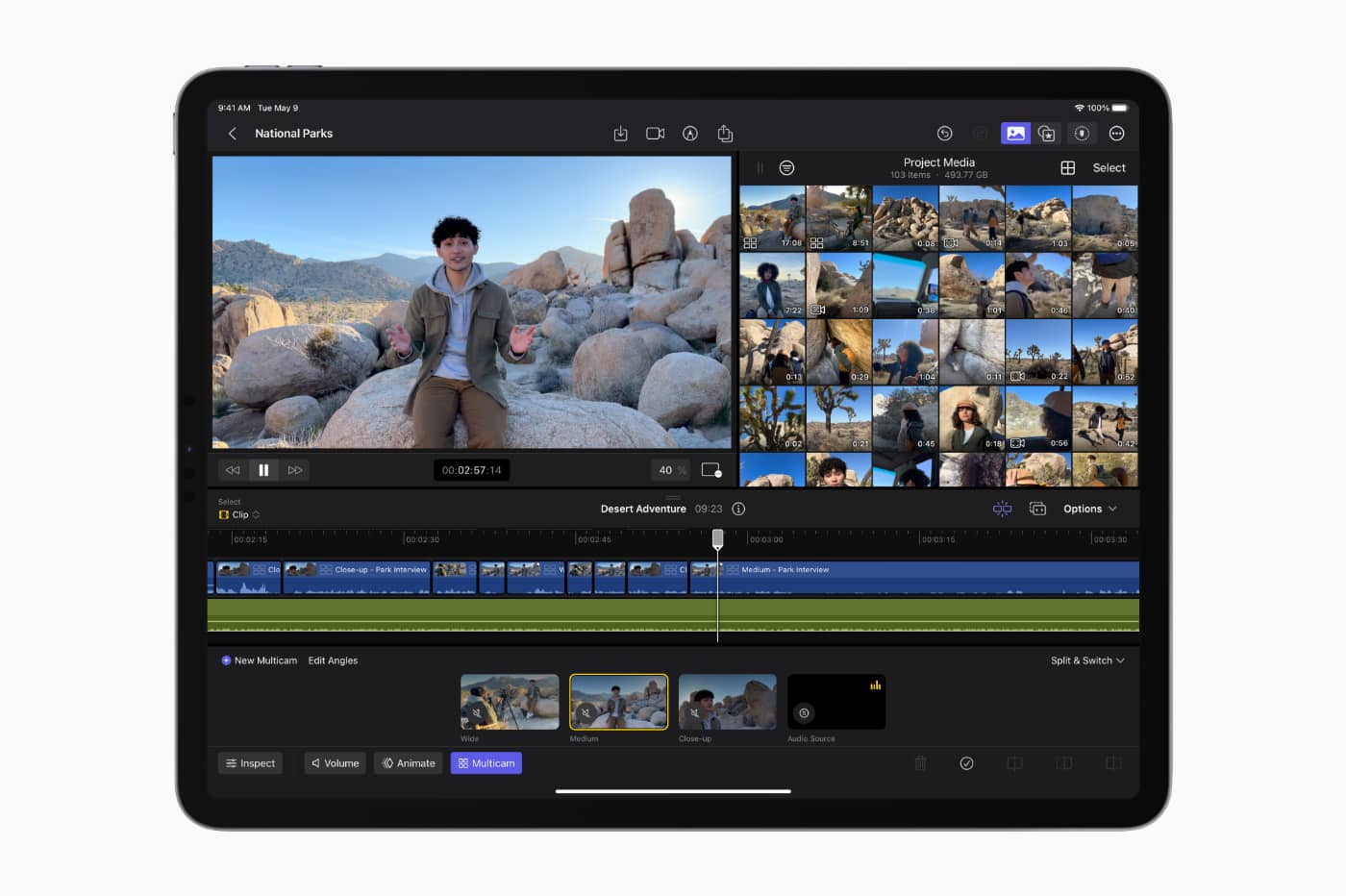 La polyvalence de l’iPad est également mise en avant, avec des fonctions comme le mode Pro Camera. L’iPad devient alors non seulement plate-forme de montage mais également outil de tournage. Il peut filmer en mode Portait ou Paysage, tout en offrant de contrôler l’audio et de surveiller le temps d’enregistrement disponible. Il est même possible de contrôler manuellement la mise au point, l’exposition ou la balance des blancs. Apple a même prévu une fonction multicam, qui permet de filmer une même scène avec plusieurs appareils, puis de monter en choisissant à la volée ses cadrages.