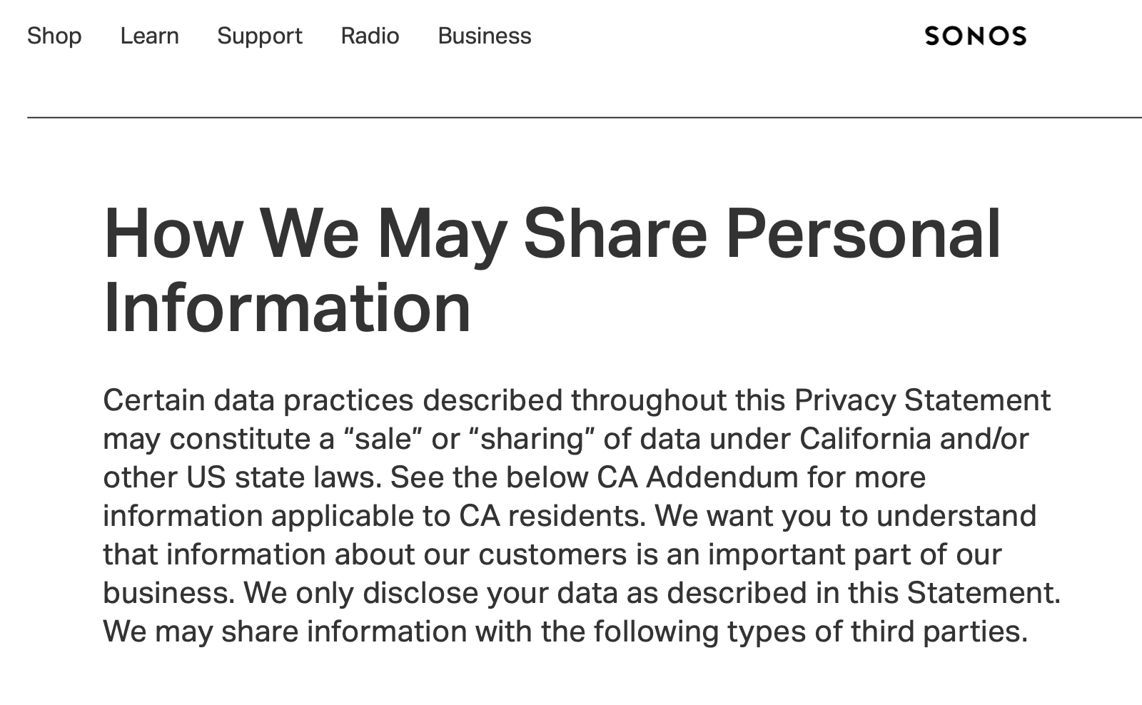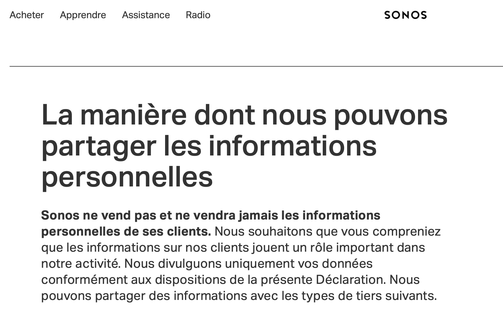 Depuis toujours, la politique de confidentialité de Sonos affiche en gros et en gras : « Sonos ne vend pas et ne vendra jamais les informations personnelles de ses clients ». Enfin ça, c’est encore le cas pour la version française. Mais pour combien de temps ? Car la mouture anglaise du même texte a fait disparaitre cette promesse, comme l’a relevé Louis Rossmann, réparateur et défenseur de la vie privée des consommateurs.