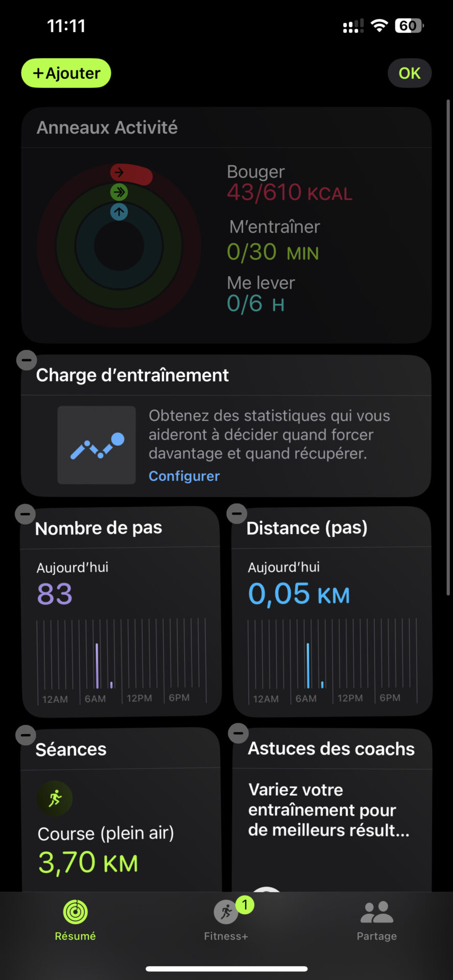 À l’image de l’écran d’accueil et du centre de contrôle, la page d’accueil de l’app Forme est elle aussi hautement personnalisable. On peut ajouter ou retirer les différentes tuiles qui compose le résumé afin d’avoir toujours sous les yeux une vue synthétique de ses exploits.