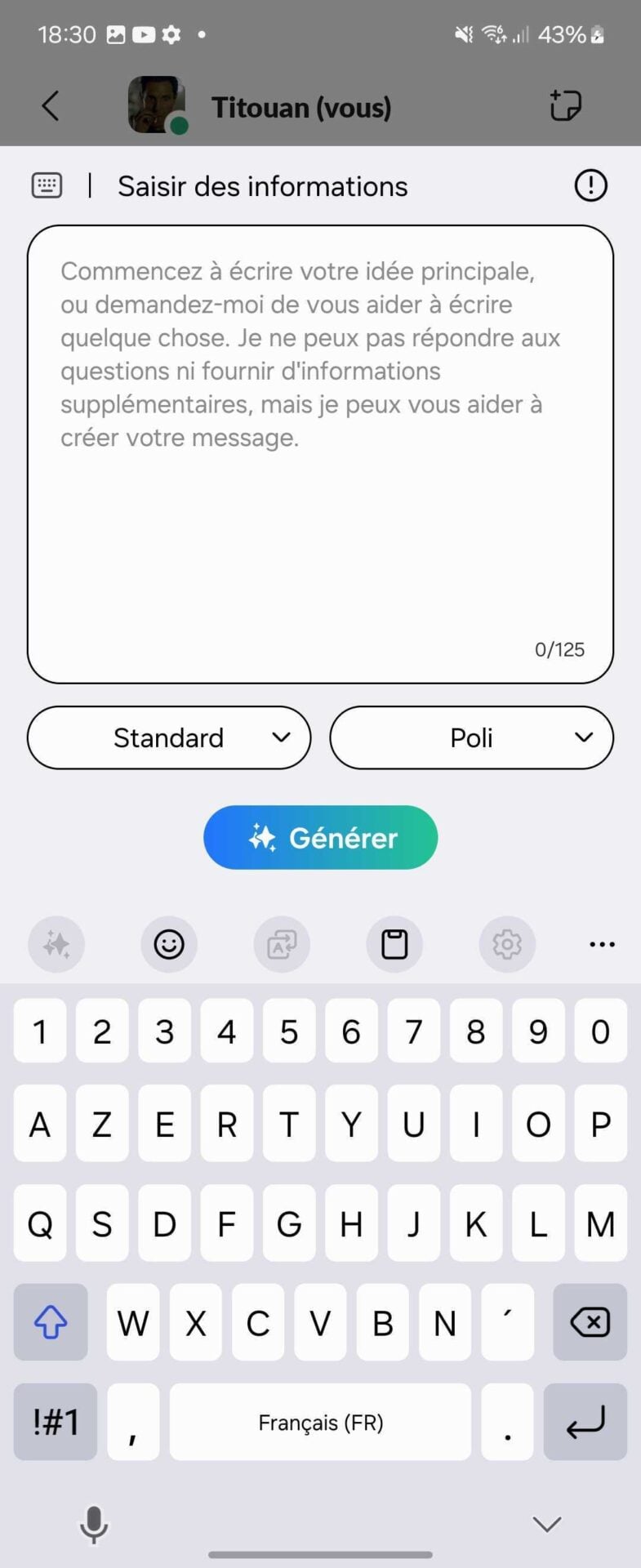 Nous avons déjà la possibilité de répondre avec l’écran externe à des messages en utilisant une IA générative. Celle-ci va s’inspirer de vos sept derniers messages envoyés dans la conversation pour tenter de coller à votre style. Si elle paraît un peu formelle au départ, les réponses finissent par gagner en naturel. Dans notre cas, émoji et tic de langages ont bien fini par s’intégrer. Il est bien sûr possible de répondre de façon traditionnelle en tapant sur le clavier externe.