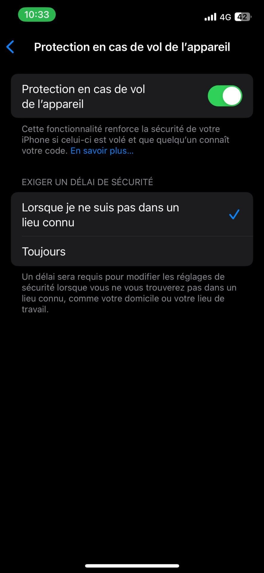 Par défaut, le système qui met en place un délai de sécurité empêchant toute modification des réglages sensibles de l’iPhone ne s’activait pas lorsque l’appareil se trouvait dans un lieu connu. Par conséquent, un vol réalisé dans l’un de ces lieux permettait au voleur de changer, par exemple, le mot de passe iCloud sans contrainte. Le problème est à présent corrigé sous iOS 17.4. Apple vient en effet d’ajouter une option vous permettant, si vous le souhaitez, de toujours exiger un délai de sécurité, et non pas uniquement lorsque vous ne vous trouvez pas dans un lieu connu.