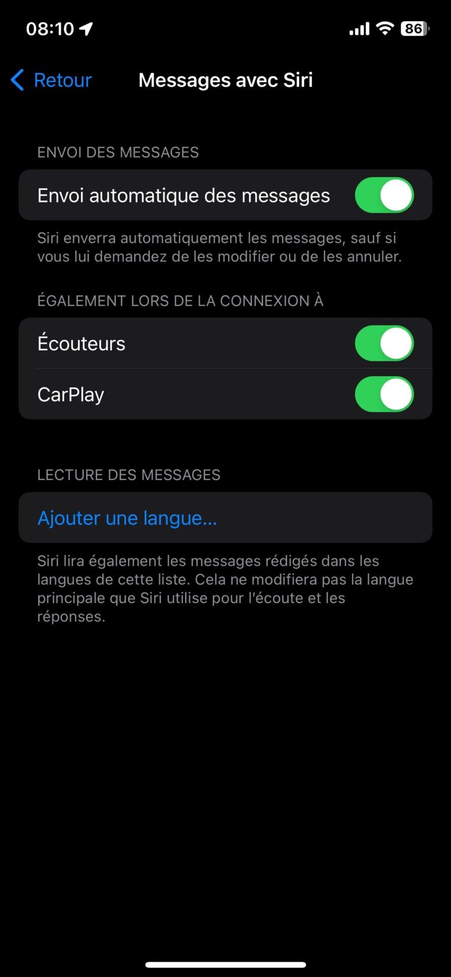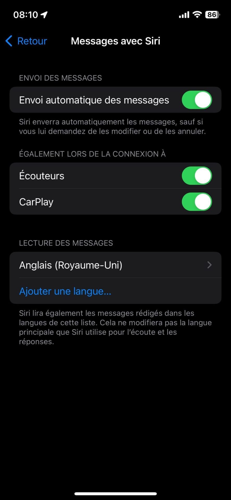Pour ajouter une langue, il faudra se rendre dans les Réglages > Siri et recherche > Message avec Siri > Ajouter une langue, pour sélectionner une ou plusieurs langues additionnelles que Siri sera en mesure d’utiliser pour lire les messages reçus dans d’autres idiomes.
