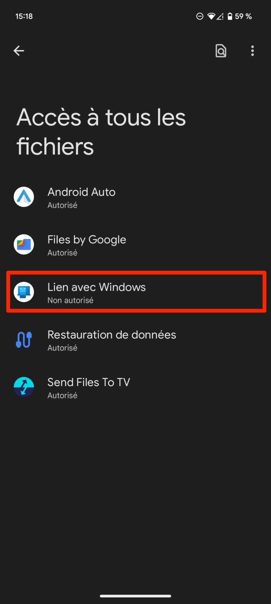 Appuyez sur Ouvrir, puis dans la fenêtre Accès à tous les fichiers du gestionnaire d’autorisation d’Android qui s’affiche, sélectionnez Lien avec Windows et activez l’option Autoriser l’accès pour gérer tous les fichiers.