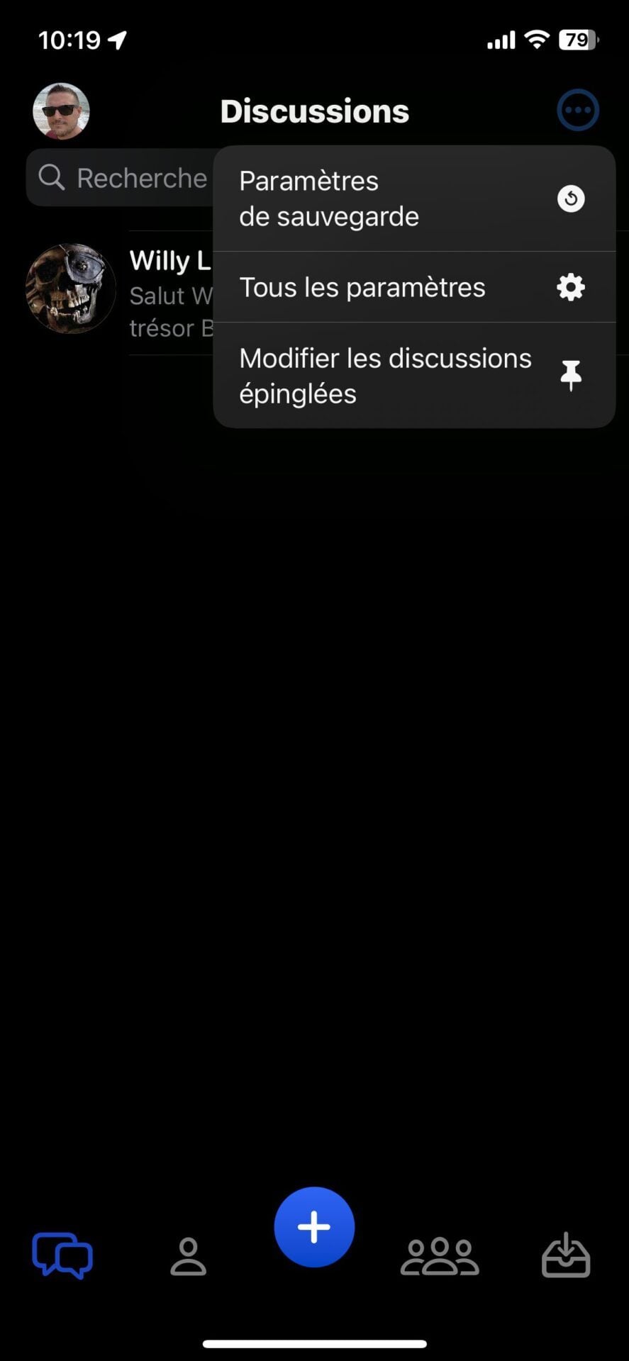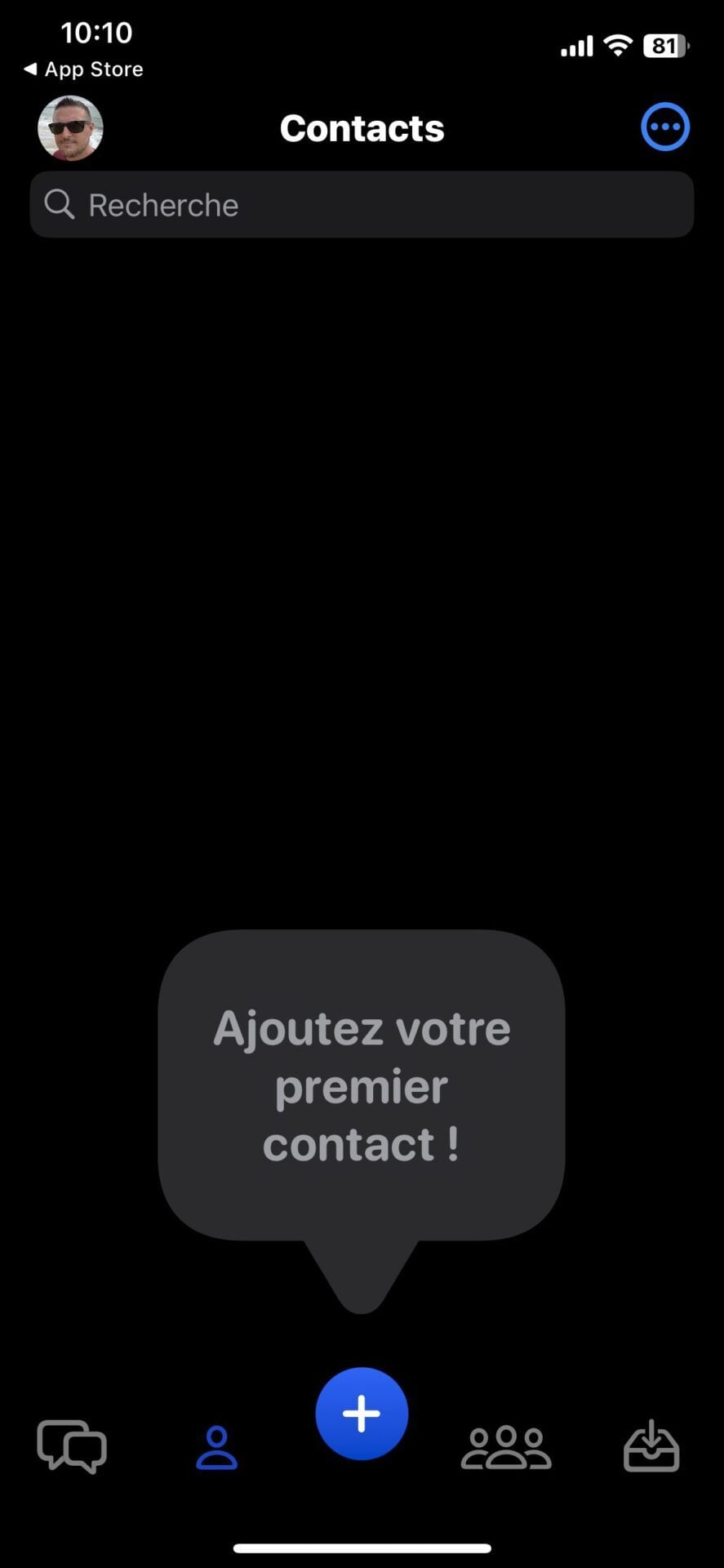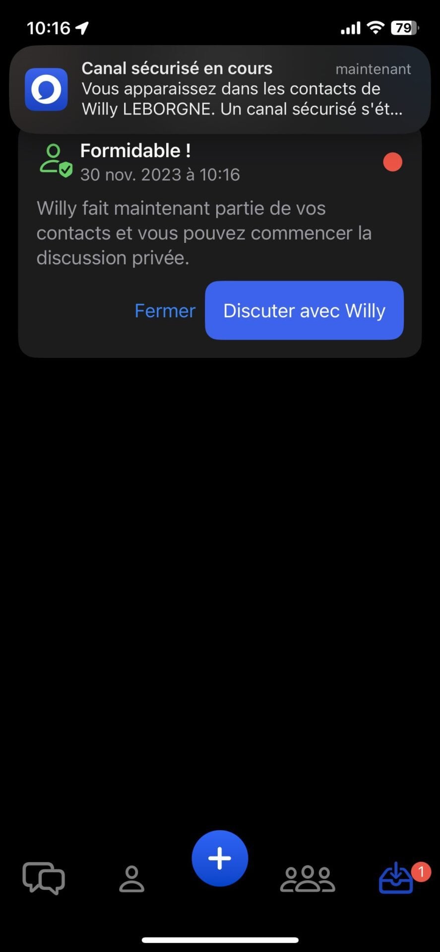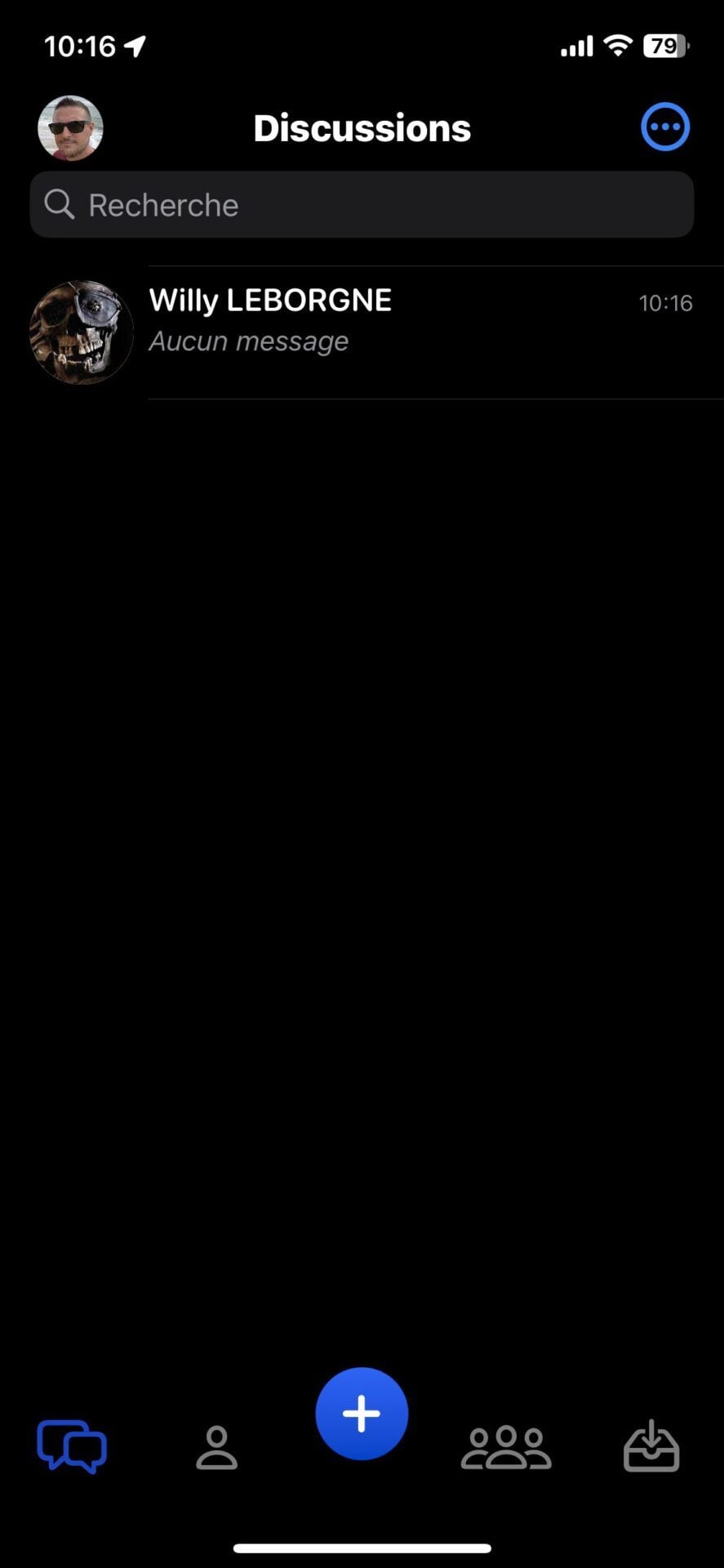 Vous devriez arriver sur la page principale de l’application, vide de messages, mais surtout de contacts. Olvid ne demandant ni votre numéro de téléphone ni votre adresse e-mail, elle ne gère pas d’annuaire centralisé et ne peut donc pas trouver vos contacts qui l’utilisent. Vous devrez donc impérativement ajouter et valider manuellement vos contacts pour pouvoir discuter avec eux.