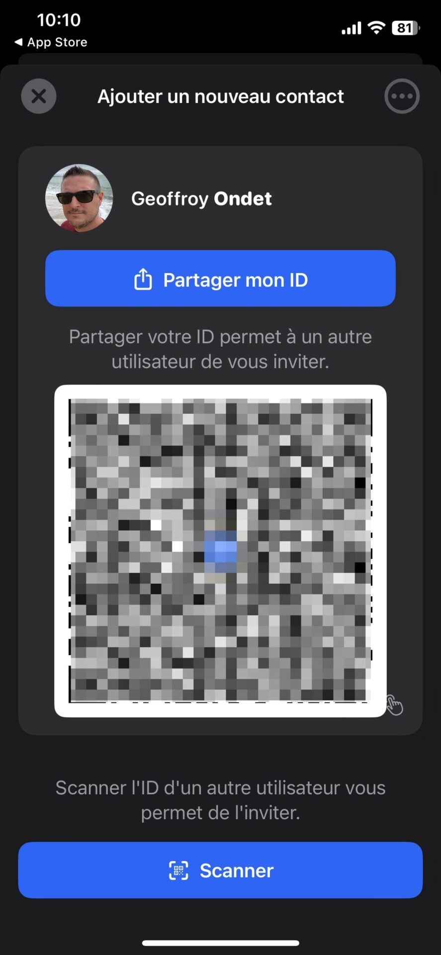 Pour ajouter votre premier contact, appuyez sur le bouton + bleu. Olvid affiche votre ID accompagné d’un QR Code. Si vos potentiels contacts sont à vos côtés, ils pourront suivre la même démarche et accepter votre invitation en scannant votre QR Code affiché.