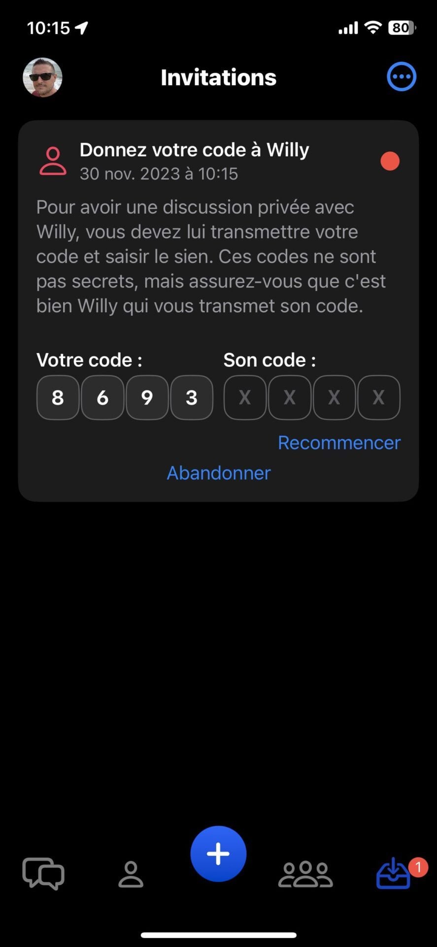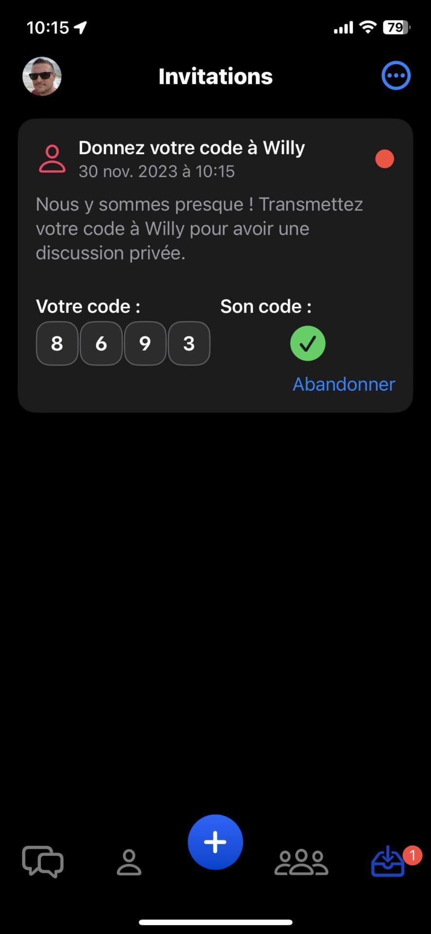 Une fois cette invitation acceptée, les deux utilisateurs voient s’afficher sur leur écran un code de validation. Chacun d’eux doit alors communiquer à l’autre son code pour qu’ils s’acceptent tous les deux mutuellement. Ce n’est qu’après cette acceptation mutuelle que le canal de conversation sécurisé est créé dans Olvid. Appuyez, vous et votre contact, sur OK pour finaliser le processus.