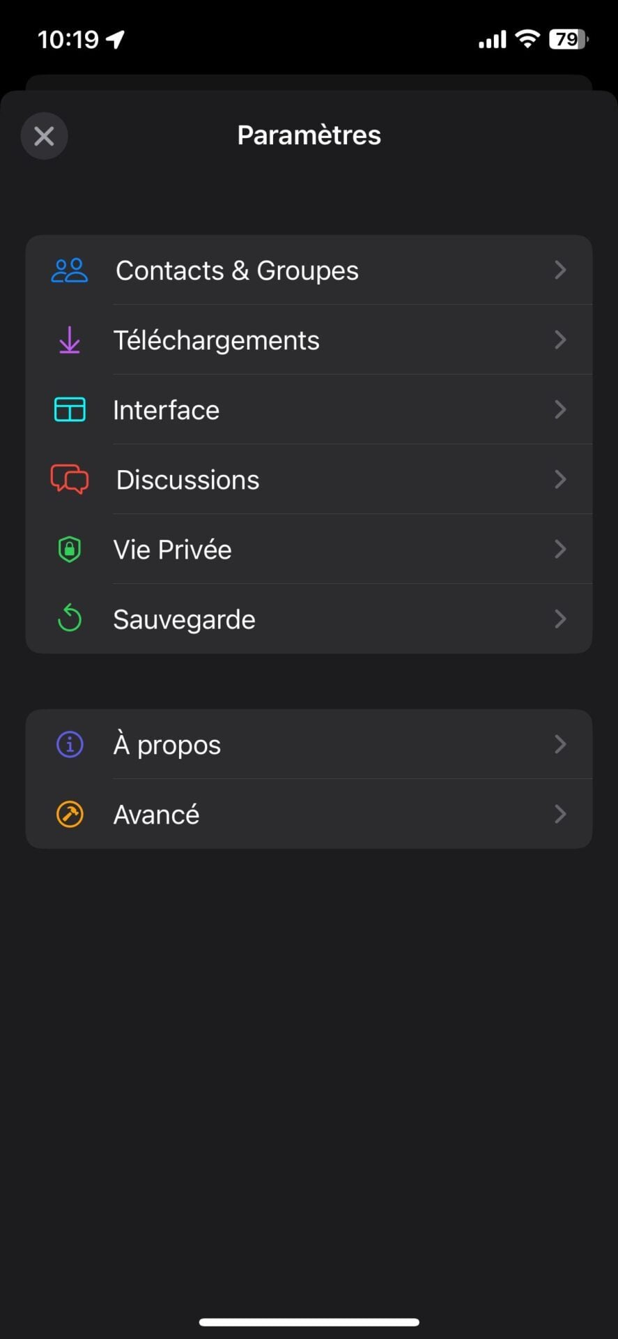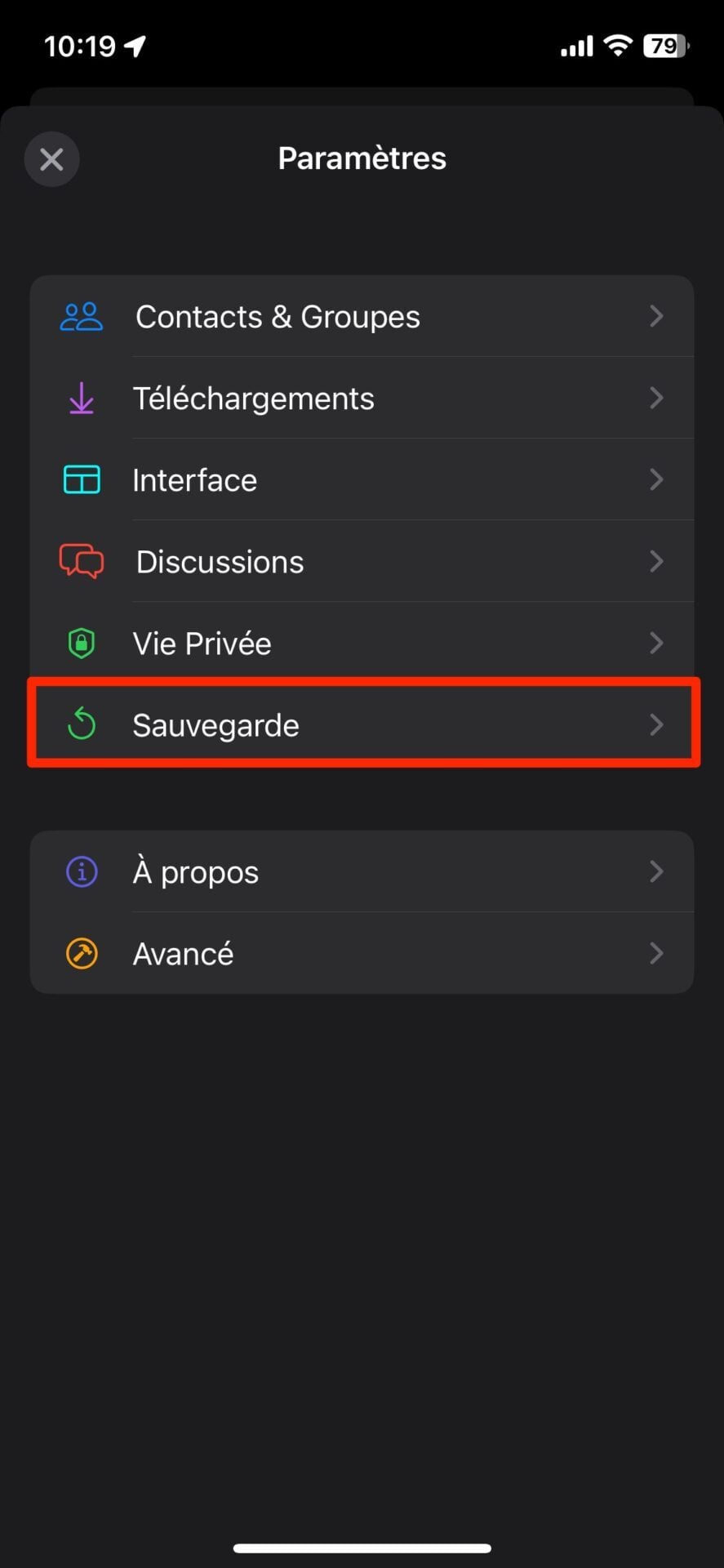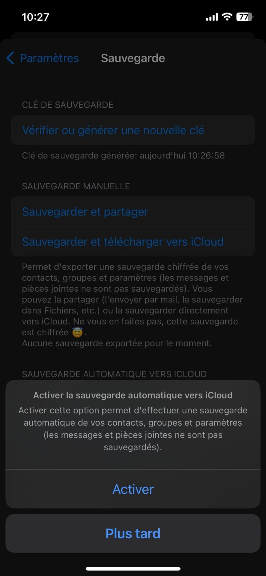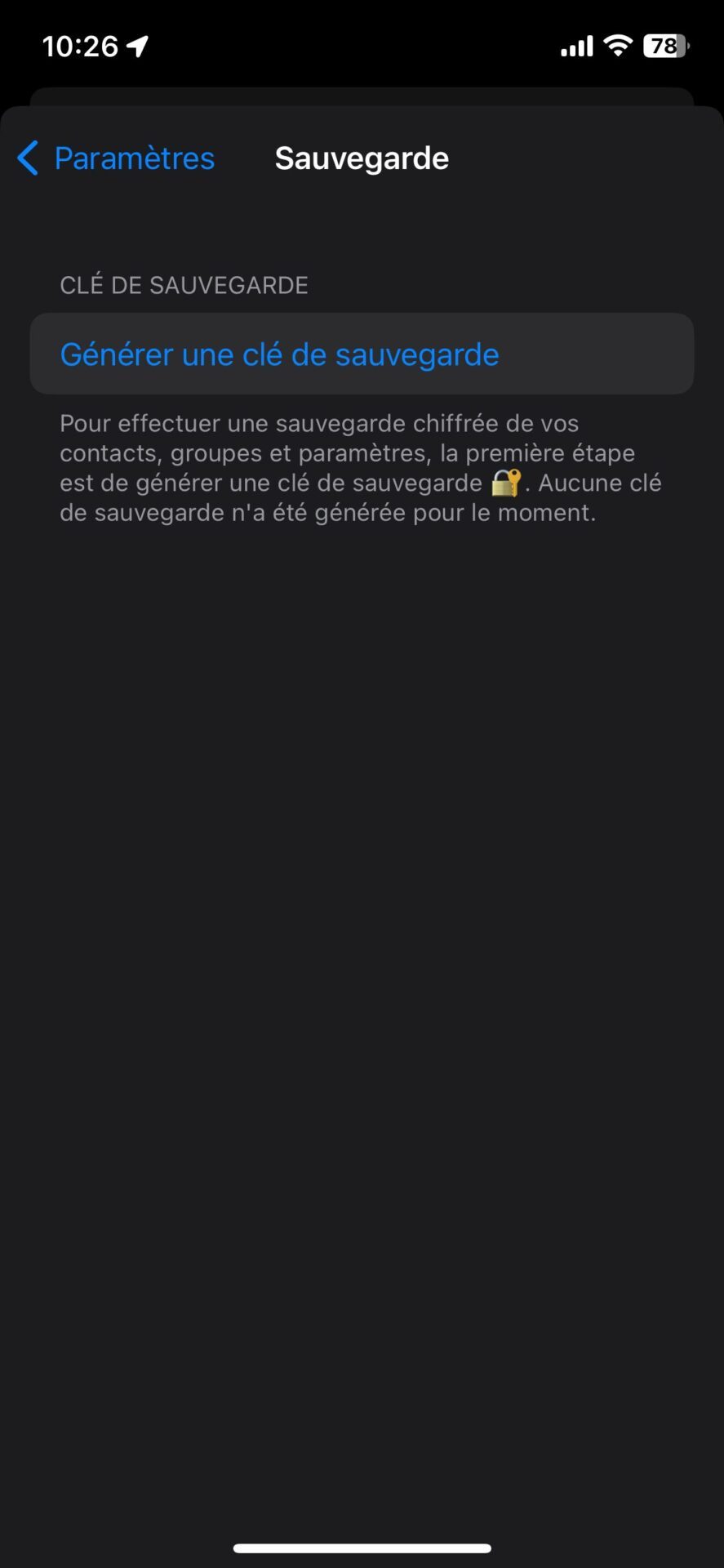 Vous pourrez aussi y définir la durée de rétention des messages, gérer les préférences en matière de visibilité des messages éphémères, etc. C’est aussi depuis les paramètres de l’application que vous pourrez générer une clé de sauvegarde nécessaire au chiffrement de la sauvegarde que vous enverrez sur le Cloud.