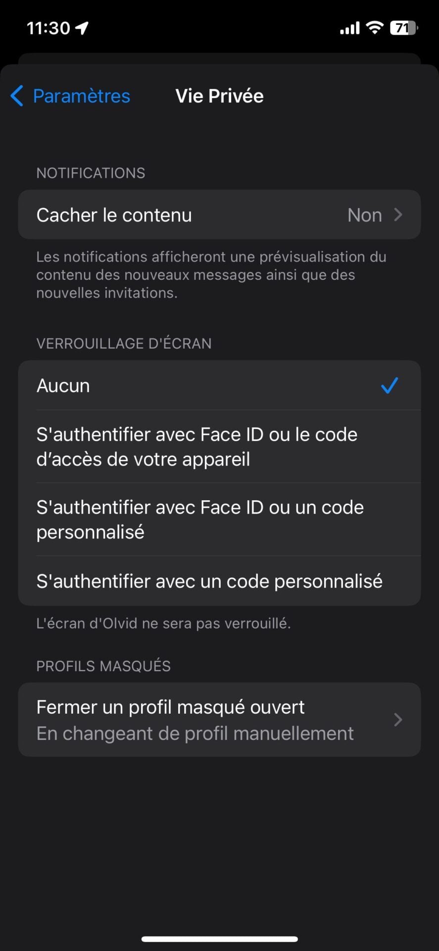 Pour ce faire, dans les Paramètres d’Olvid, rendez-vous dans le menu Vie privée pour y sélectionner le type de verrouillage à appliquer. Vous pourrez, au choix, vous authentifier avec le module de reconnaissance faciale ou le capteur d’empreinte digital intégré à votre smartphone, à l’aide d’un code. Libre à vous d’opter pour la solution que vous sied le mieux.