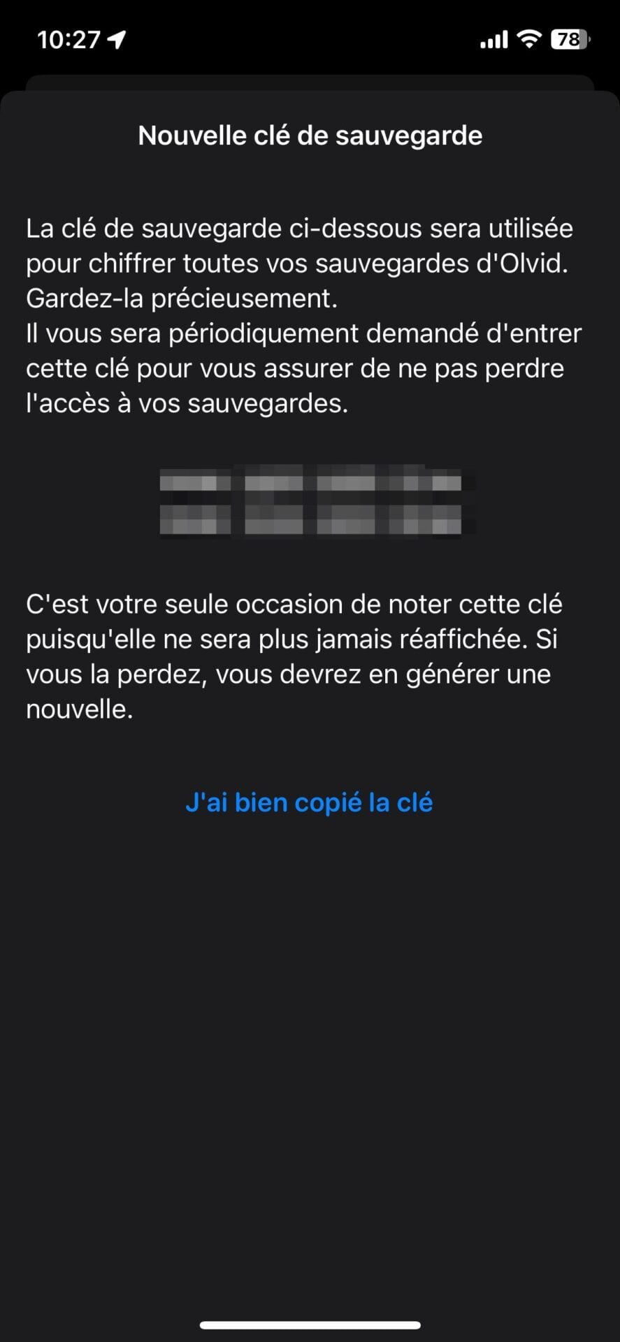 Pour sauvegarder vos données sur iOS, rendez-vous dans les Paramètres de l’application, puis dans le menu Sauvegarde, appuyez sur Générer une clé de sauvegarde. Enregistrez la clé unique affichée à l’écran en la stockant en lieu sûr, par exemple dans un gestionnaire de mots de passe. Appuyez ensuite sur Activer pour activer la sauvegarde automatique vers iCloud.