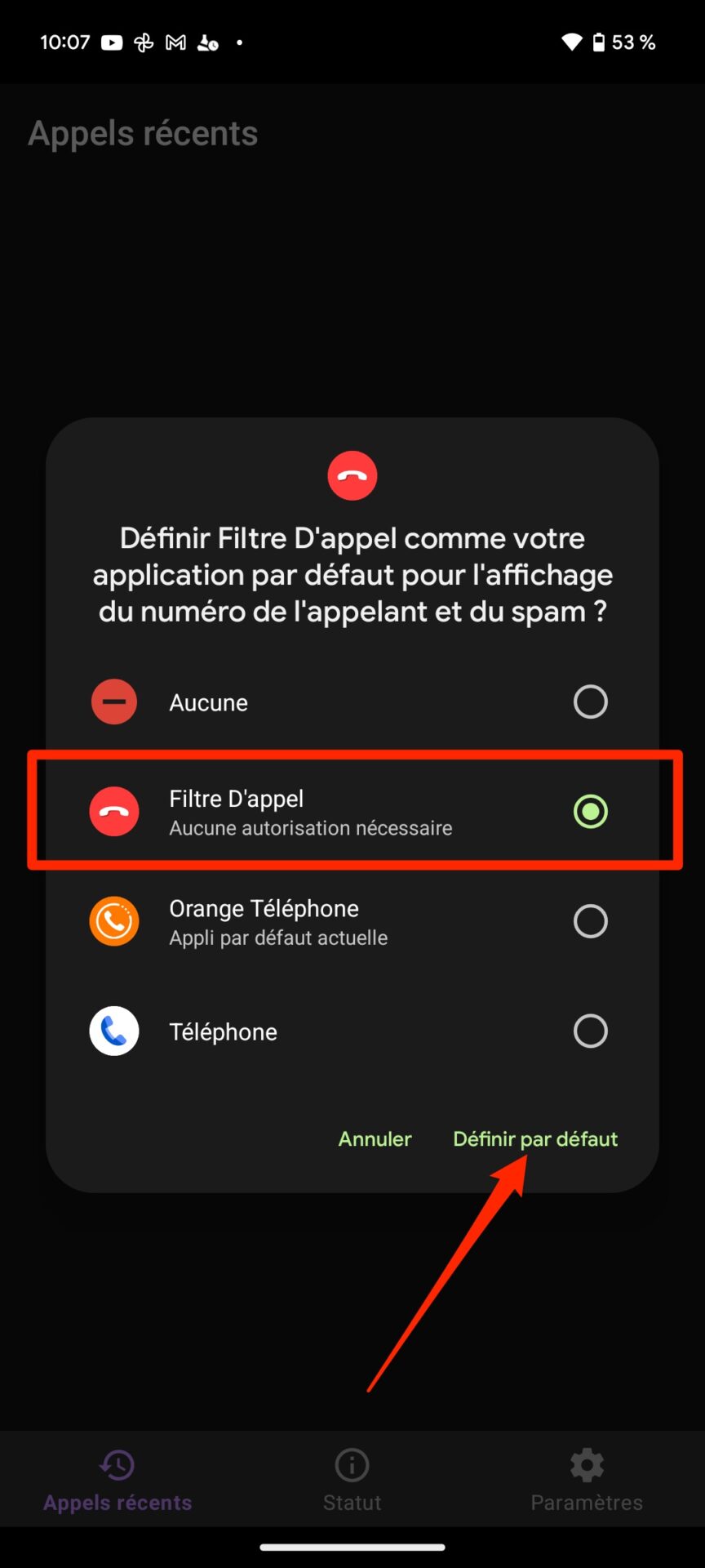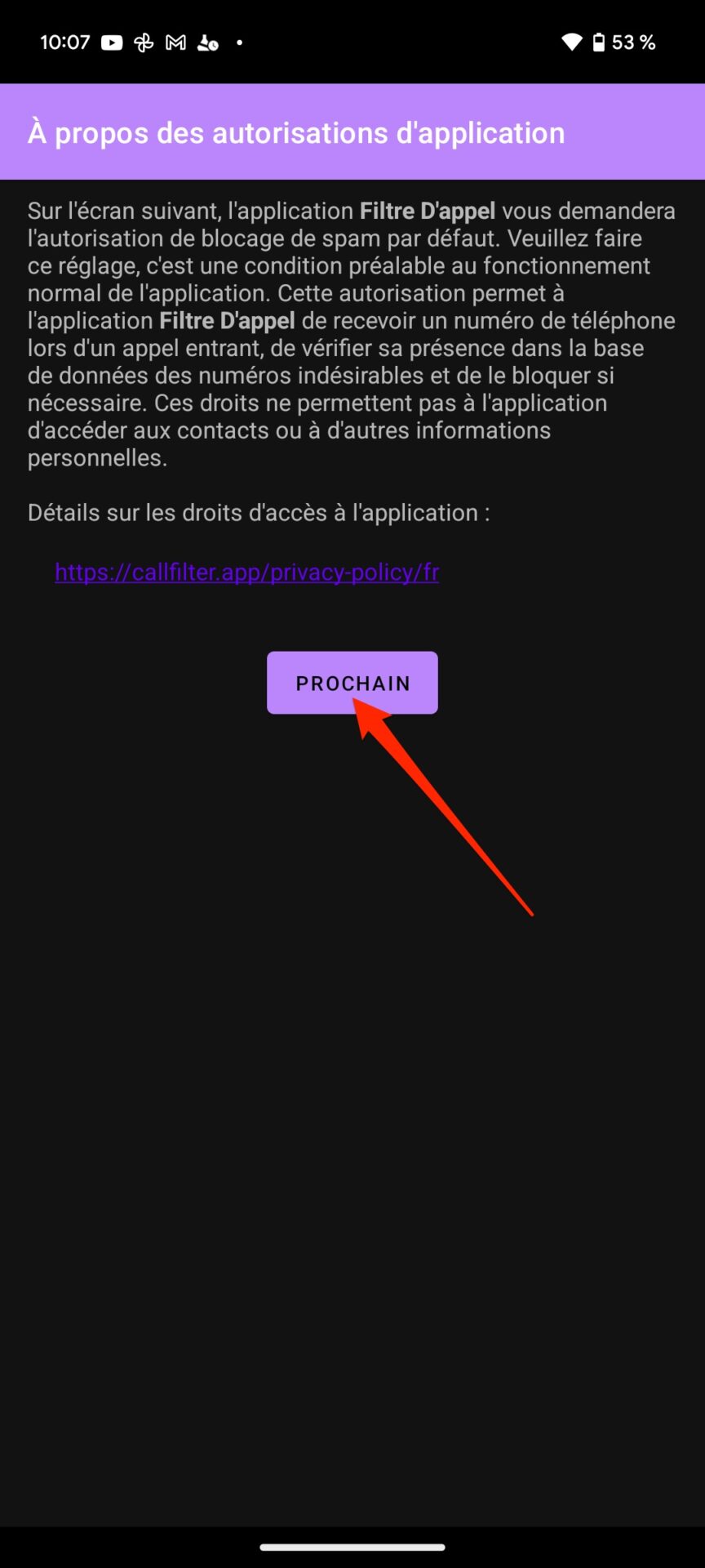 Ouvrez à présent l’application sur votre appareil. Avant de pouvoir l’utiliser, vous devez impérativement accepter les Règles et politiques de confidentialité de l’application. Appuyez sur Accepter et continuer. Filtre d’appel affichera ensuite un avertissement pour vous prévenir que l’application requiert l’autorisation d’Android pour être utilisée comme application par défaut pour bloquer les spams. Appuyez ainsi sur le bouton Prochain (oups la traduction !). Vous devriez alors voir s’afficher le pop-up vous invitant à Définir Filtre d’appel comme votre application par défaut pour l’affichage du numéro de l’appelant et du spam. Appuyez donc sur le bouton Définir par défaut.