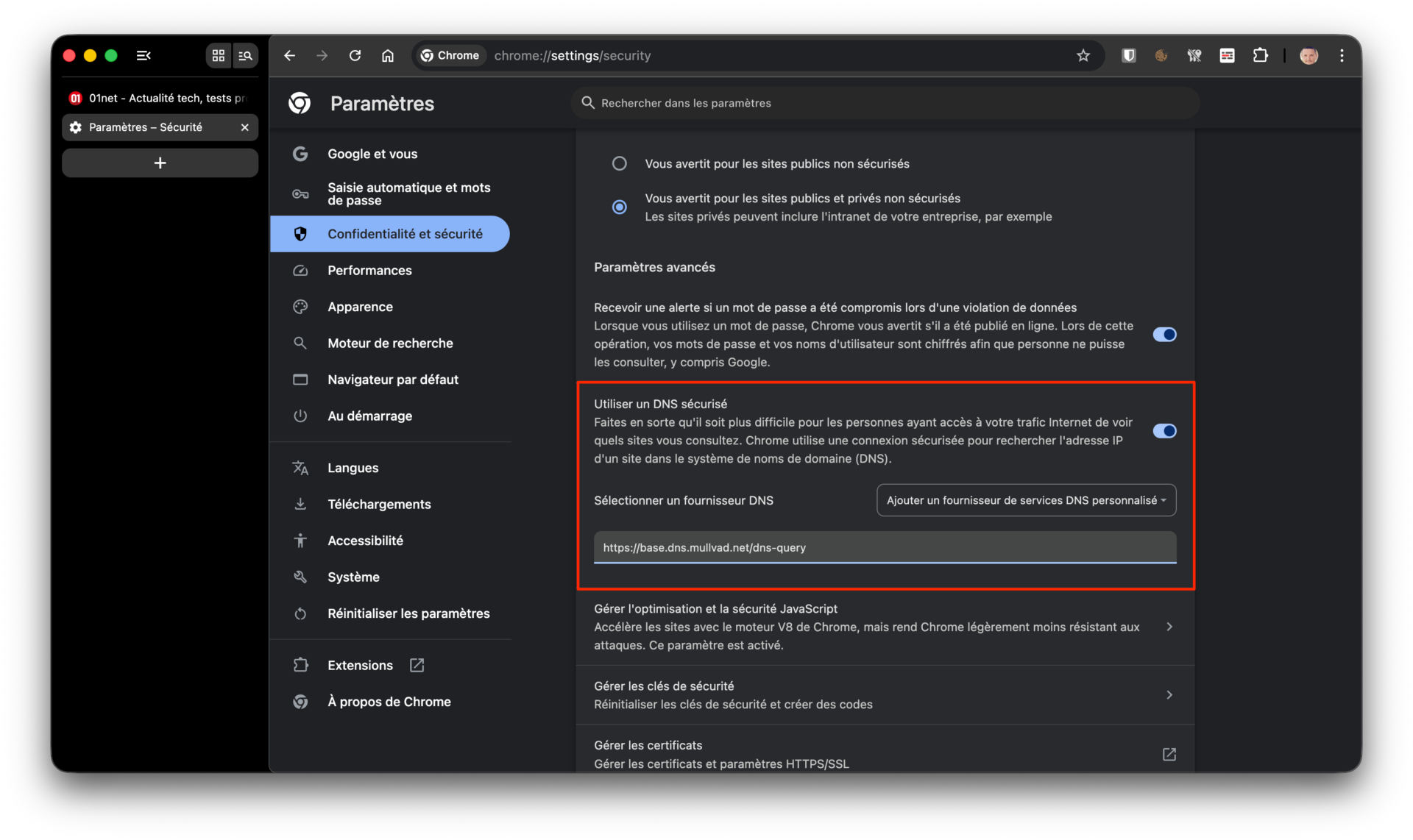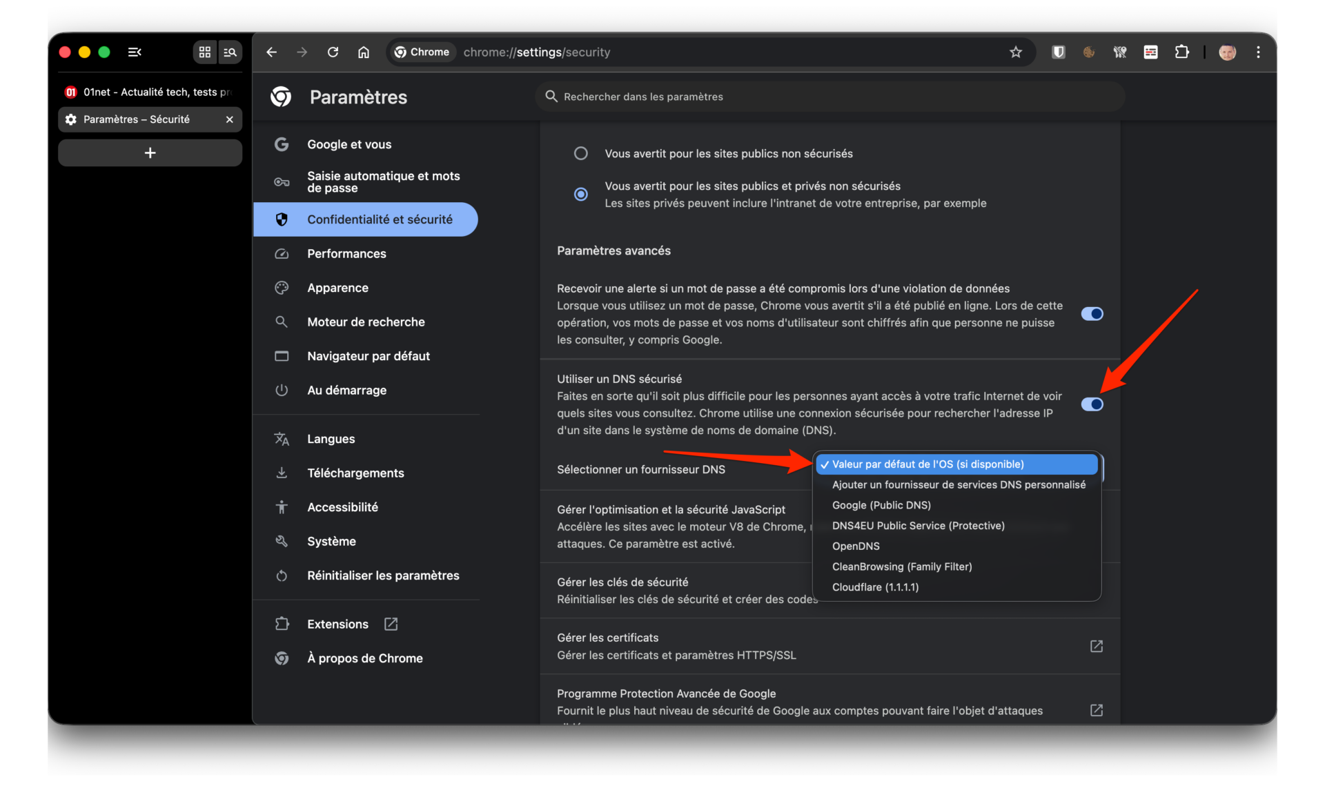 Si vous utilisez Google Chrome, vous pourrez changer de DNS en vous rendant directement dans les Paramètres du navigateur. Entrez dans la section Confidentialité et sécurité, et rendez-vous dans le menu Sécurité.