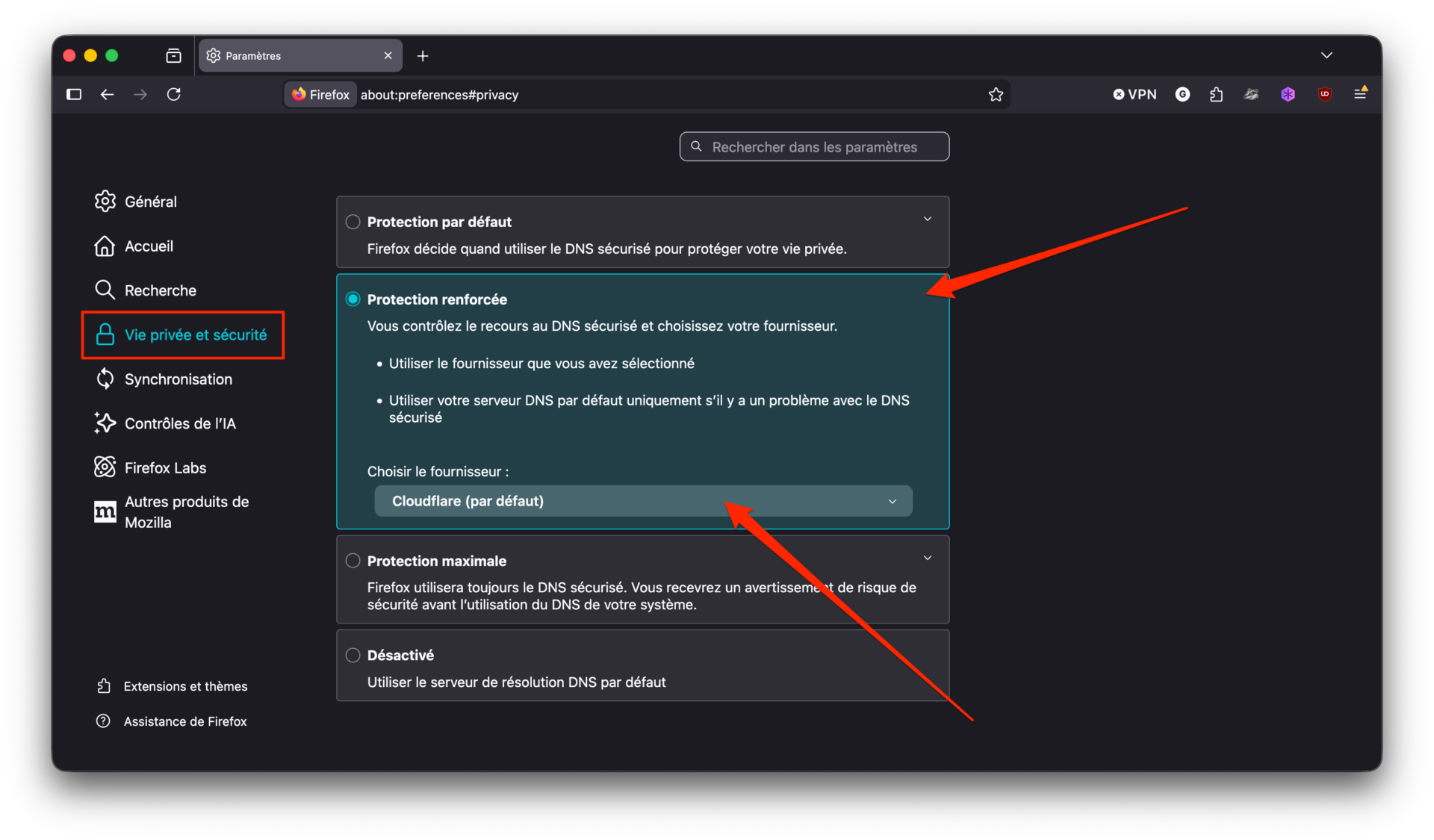 Sur Firefox, la marche à suivre est assez similaire. Accédez aux Paramètes du navigateur, sélectionnez Vie privée et sécurité dans la colonne de gauche, faites défiler toutes les options jusqu’à atteindre la section DNS via HTTPS (tout en bas de la page).