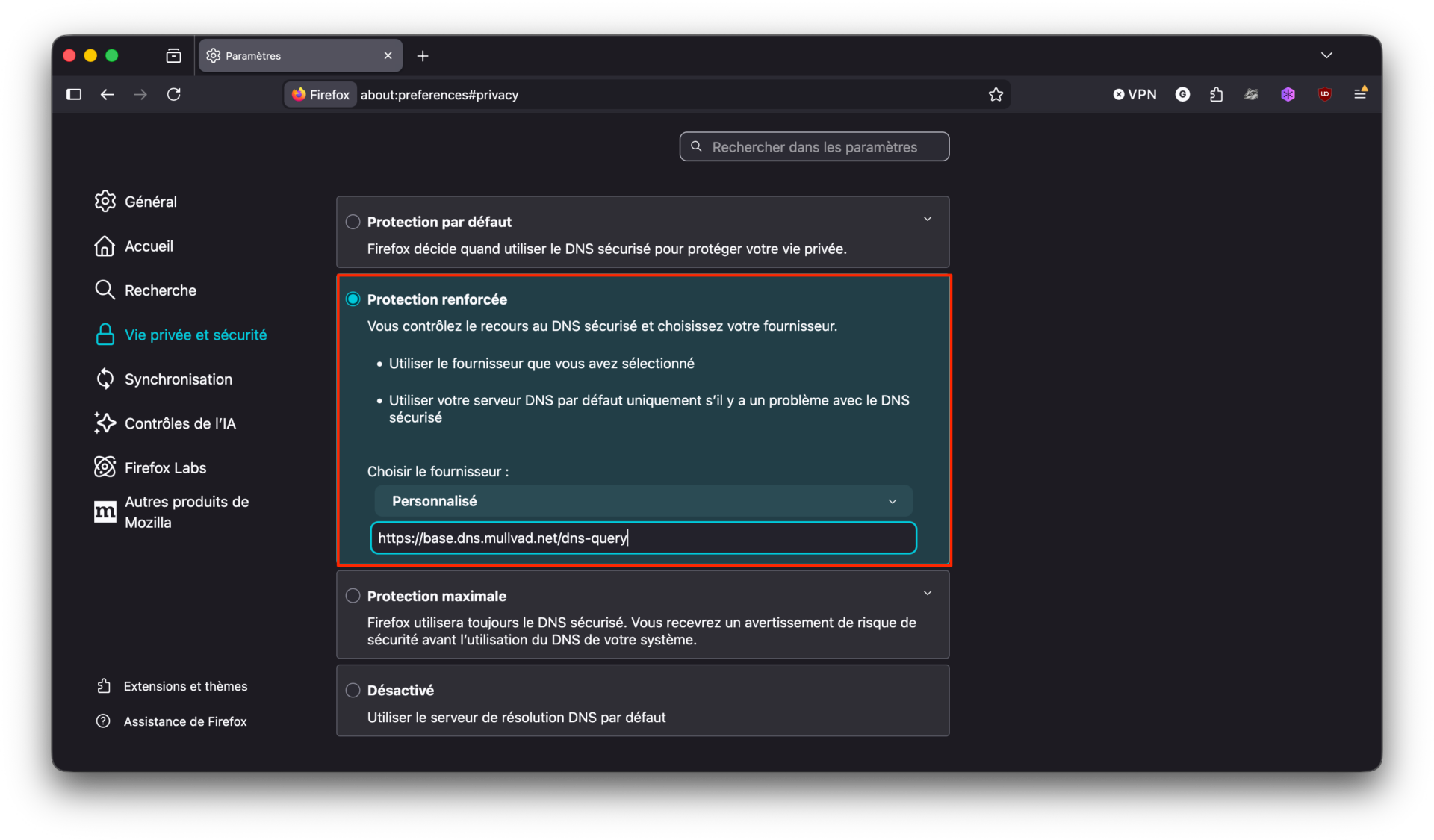 Sélectionnez au moins la Protection renforcée, puis dans le menu déroulant associé, choisissez un des fournisseurs DNS suggérés par Firefox, ou chosissez Personnalisé pour renseigner l’URL de résolveur DNS de votre choix.