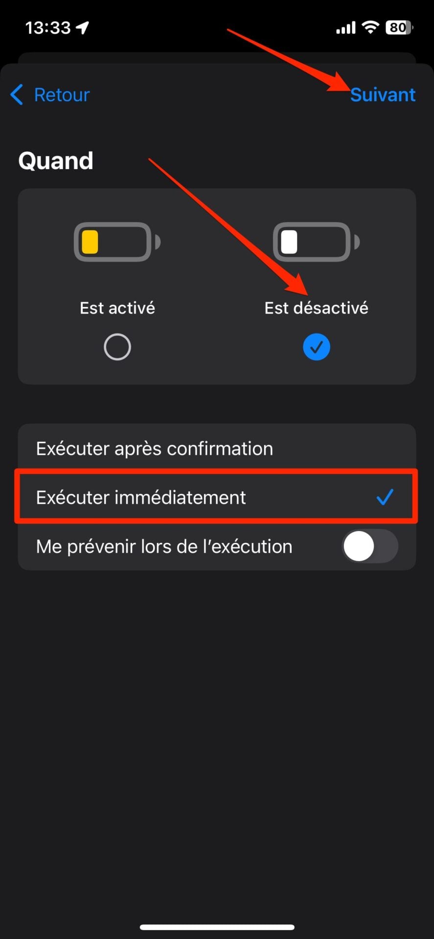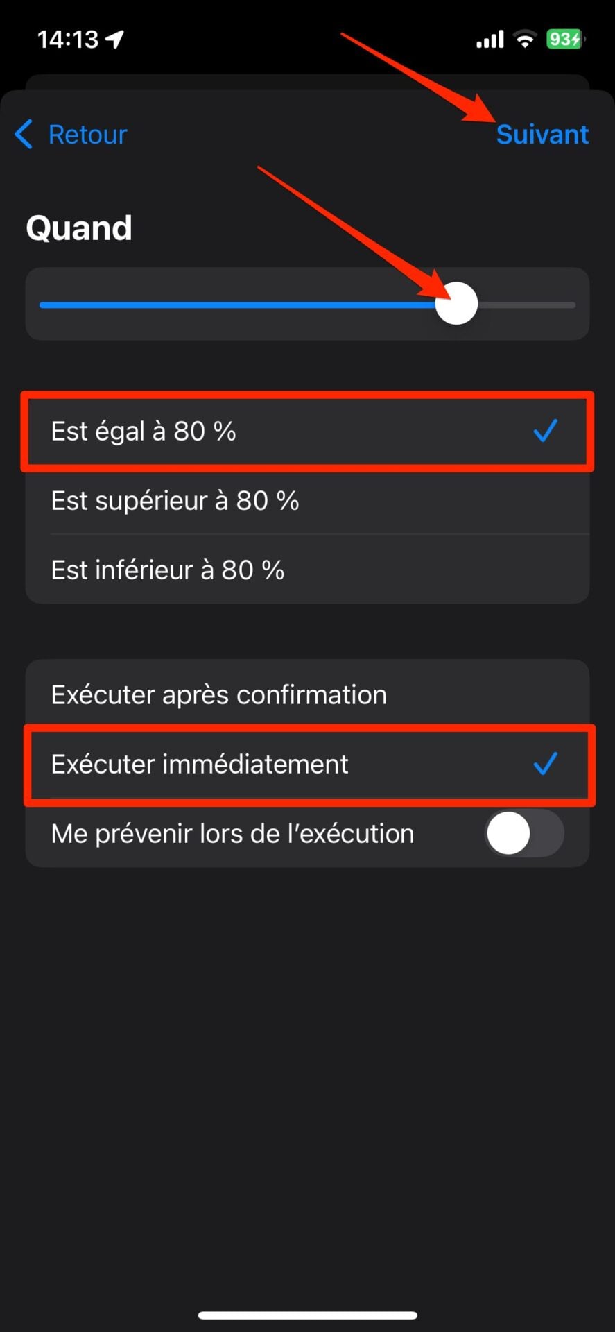Dans la fenêtre Automatisation personnelle qui s’affiche, faites défiler les options et sélectionnez Niveau de la batterie. Ajustez ensuite le curseur pour définir le niveau de batterie à partir duquel vous souhaitez activer automatiquement le Mode économie d’énergie, ici pour notre exemple nous souhaitons qu’il se déclenche dès que la batterie baisse à 80 %. Sélectionnez, en dessous, l’option Exécuter immédiatement. Appuyez ensuite sur Suivant.