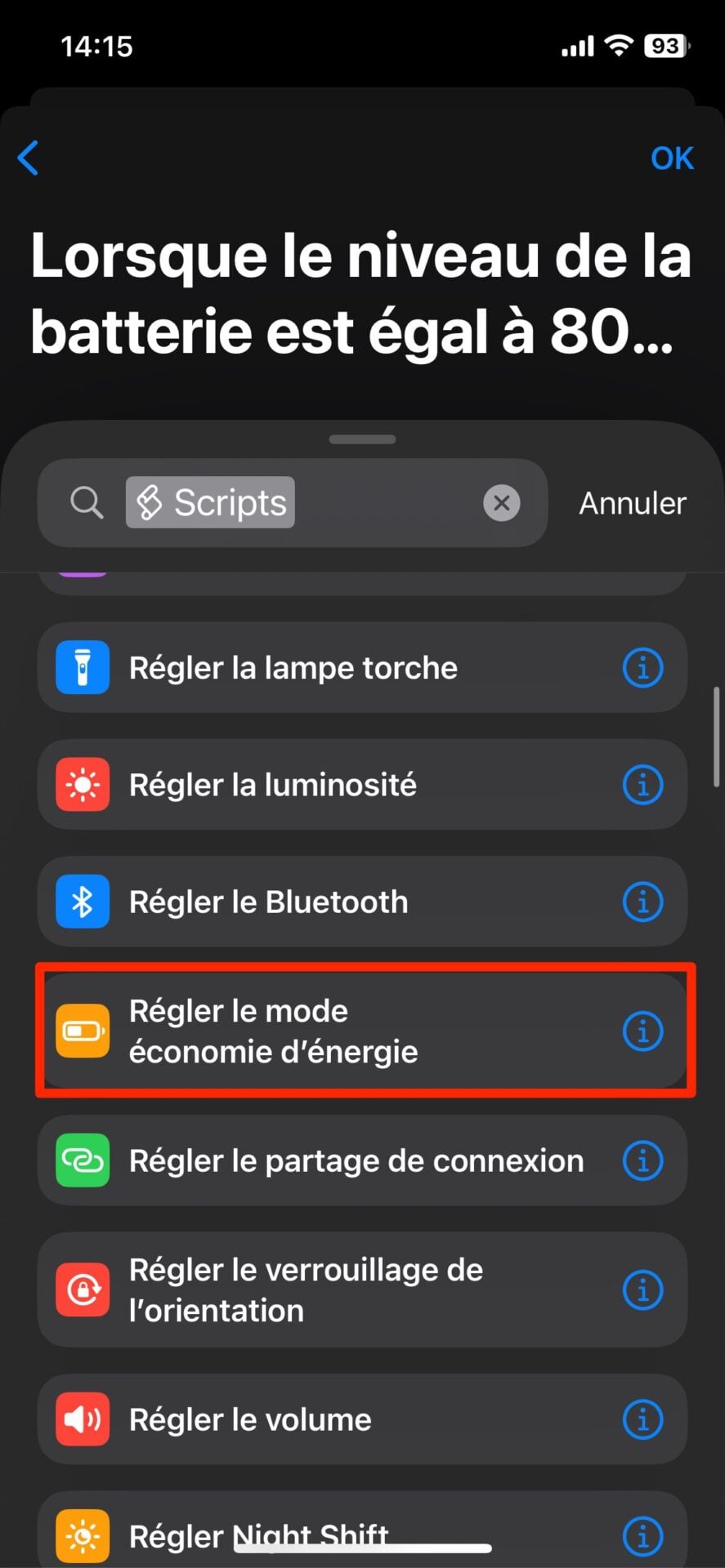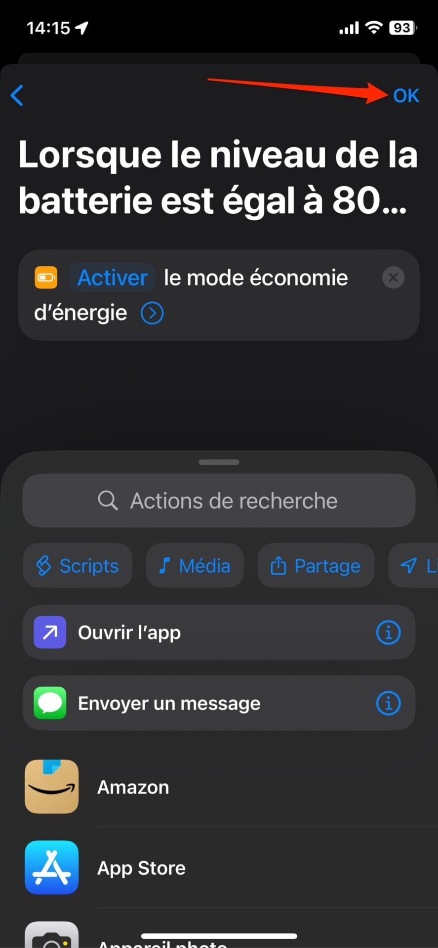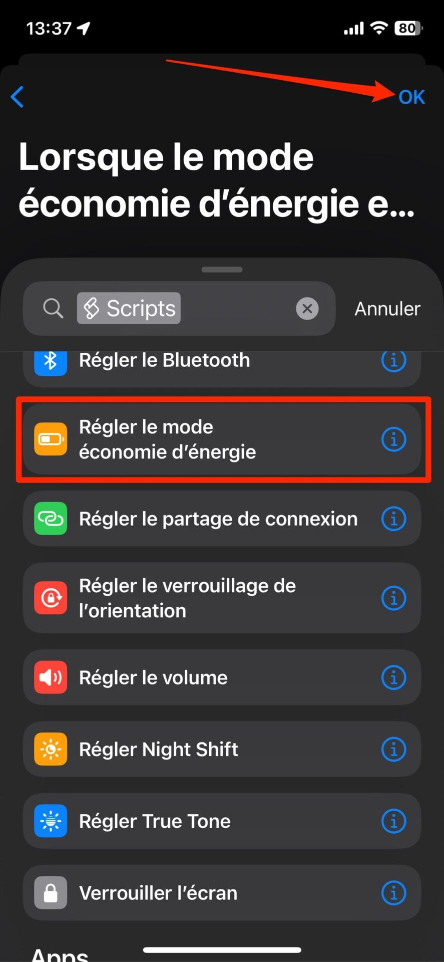 Appuyez ensuite sur le bouton OK en haut à droite. Votre script d’automatisation pour conserver le Mode économie d’énergie actif constamment est prêt. Pour qu’il se mette en route la première fois, vous devrez toutefois activer puis désactiver manuellement le Mode économie d’énergie. Une fois cette formalité remplie, le Mode économie d’énergie d’iOS devrait être constamment actif sur votre iPhone.