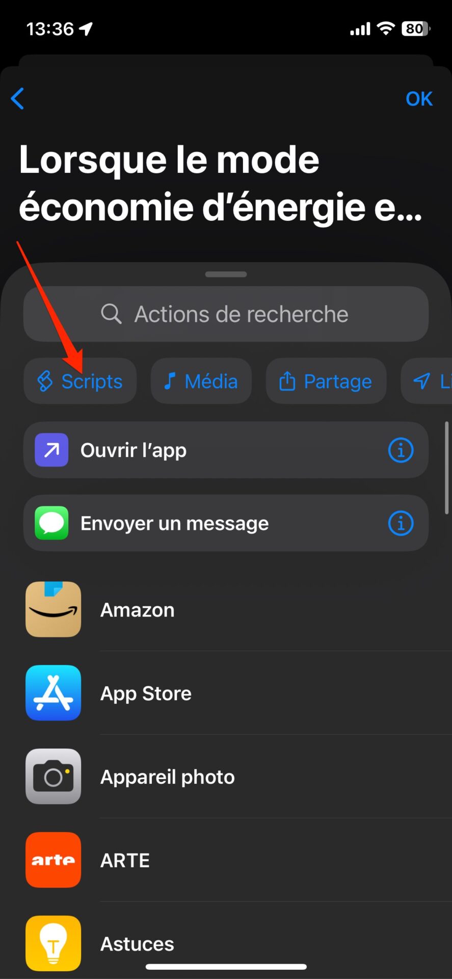 Dans la fenêtre suivante intitulée « Lorsque le mode économie d’énergie est désactivé », appuyez sur le bouton Nouvelle automatisation vide. Sélectionnez ensuite le filtre Scripts, faites défiler les options et choisissez Régler le mode économie d’énergie.