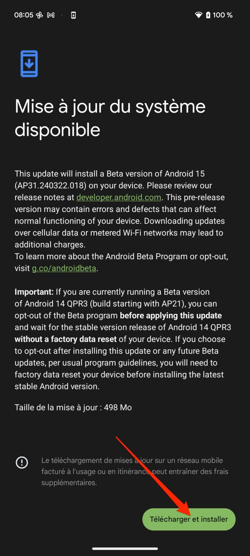 Votre smartphone est à présent enregistré dans le programme Beta d’Android 15. L’installation de la première bêta sur votre appareil s’effectue entièrement OTA, autrement dit sans fil, en téléchargeant directement la mise à jour depuis votre smartphone.