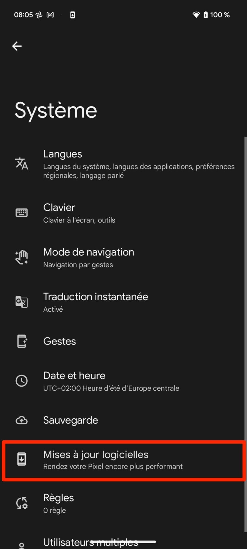 Pour ce faire, ouvrez les Paramètres d’Android, puis dans le menu Système, rendez-vous dans la section Mises à jour logicielles. Sélectionnez ensuite Mise à jour du système.