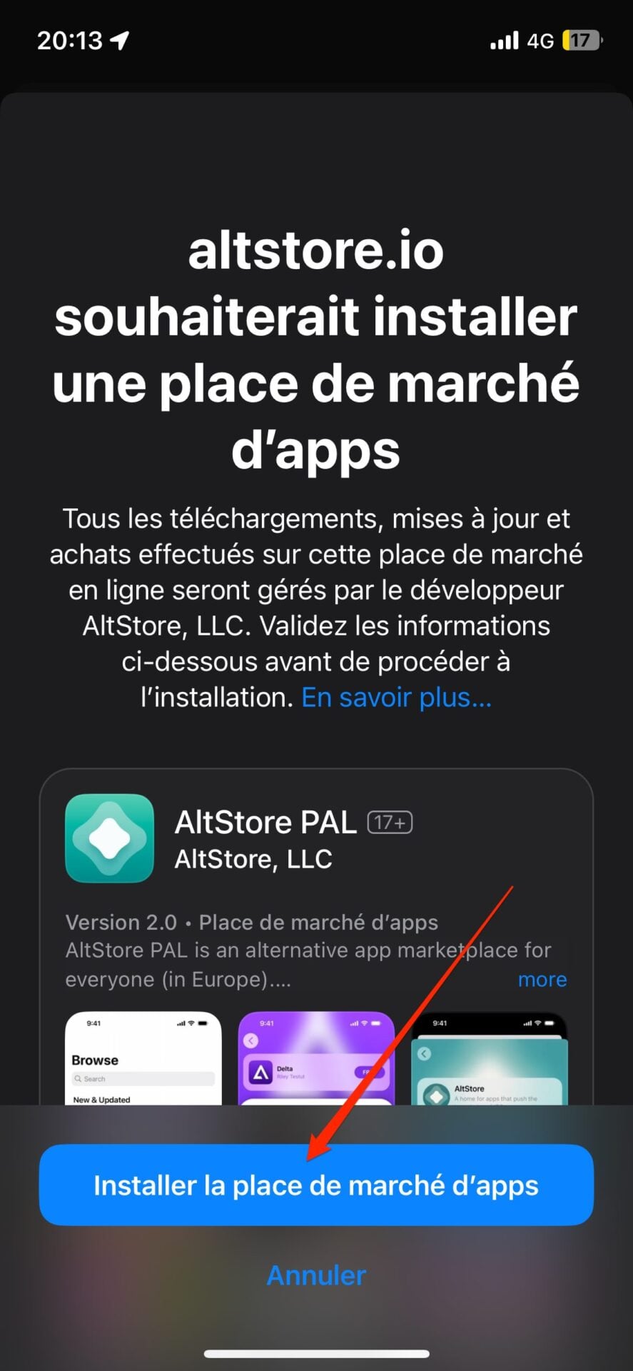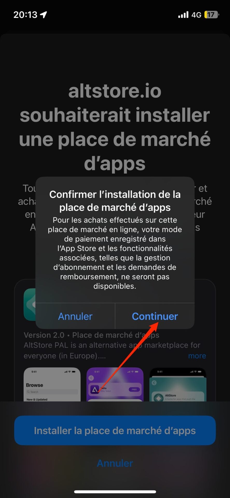 Vous voici, en principe, enfin face à l’écran d’installation de l’AltStore indiquant que altstore.io souhaiterait installer une place de marché d’apps. Appuyez sur le bouton Installer la place de marché d’apps, puis dans pop-up de confirmation qui s’affiche, choisissez Continuer.