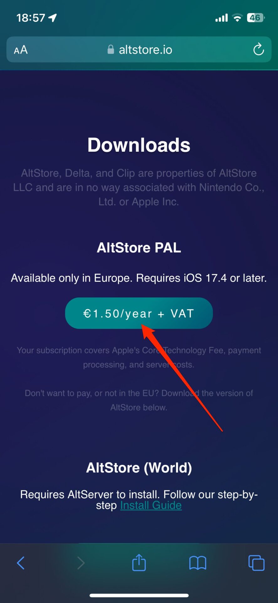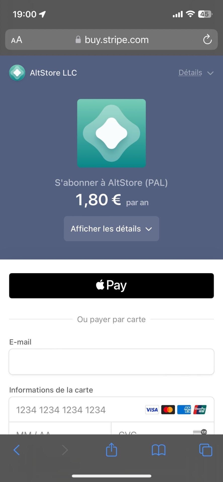 Ouvrez Safari et rendez-vous sur le site https://altstore.io. Comme nous l’avons dit précédemment, l’installation de l’AltStore n’est pas gratuite. Elle vous sera facturée sous la forme d’un abonnement annuel, moyennant 1,80 euro TTC en France. Appuyez ensuite sur le bouton Get AltStore puis sur le bouton € 1.50/year + VAT. Vous devriez être automatiquement redirigé vers la plate-forme de paiement Stripe sur laquelle vous pourrez régler votre achat en saisissant directement les coordonnées de votre carte bancaire, ou en effectuant un paiement avec Apple Pay.