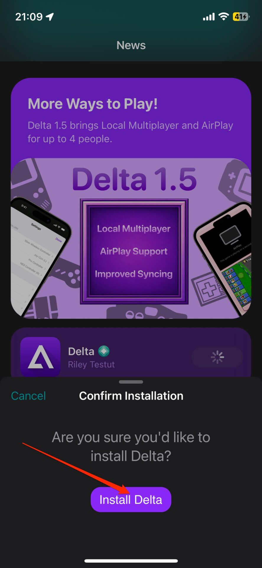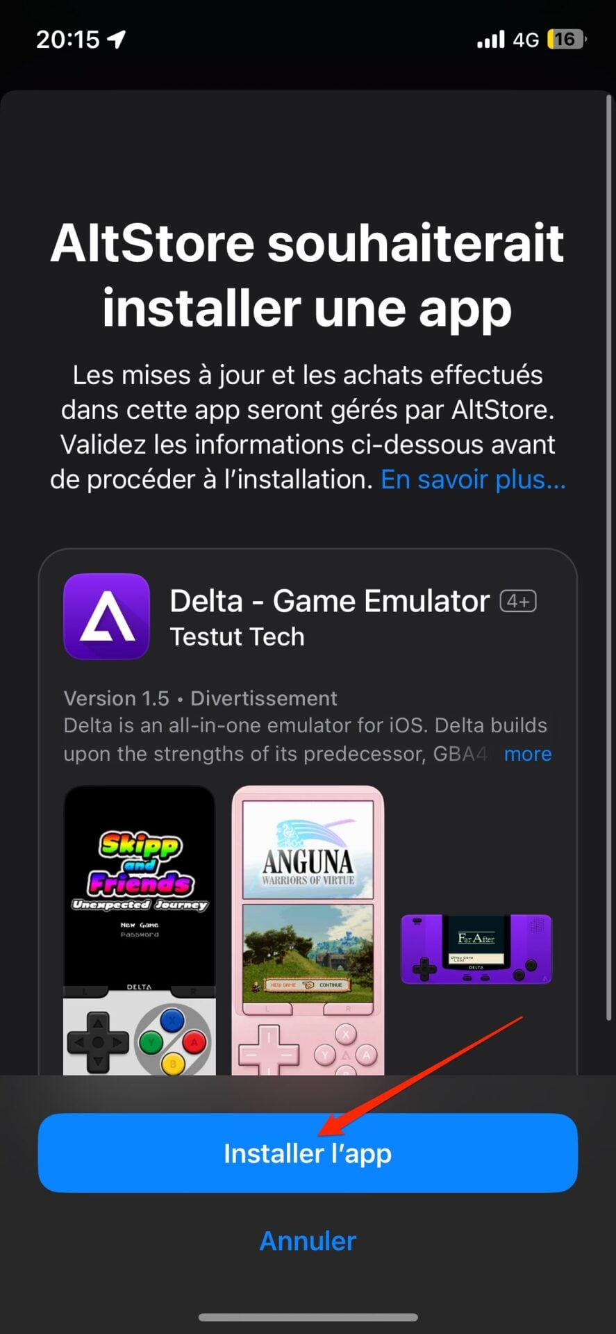 Pour installer votre première application depuis l’AltStore, appuyez simplement sur le bouton Free de Delta, par exemple, puis validez en appuyant sur Install Delta dans le volet qui s’affiche en bas de l’écran. Appuyez ensuite sur Installer l’app dans la fenêtre qui s’affiche, authentifiez-vous et patientez quelques secondes. L’émulateur devrait alors automatiquement s’installer sur votre appareil.