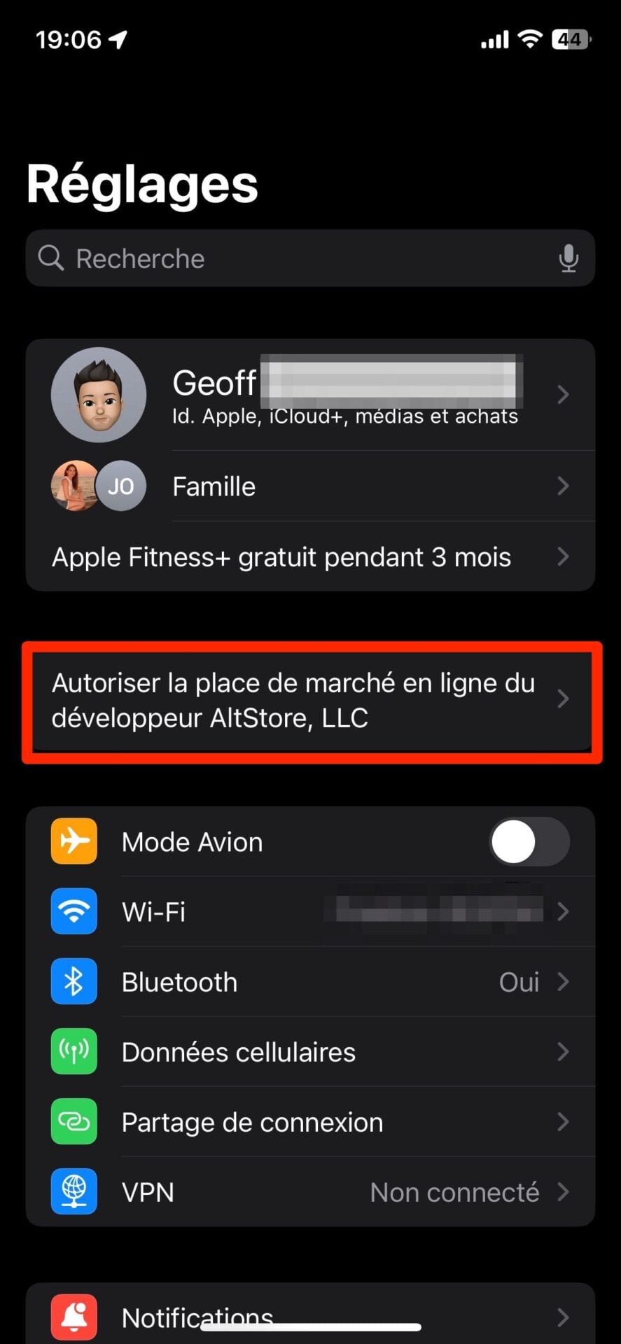 Ouvrez à présent les Réglages de l’iPhone. En haut de l’écran, juste en dessous des informations de votre compte Apple, un bandeau « Autoriser la place de marché en ligne du développeur AltStore, LLC » est affiché. Appuyez dessus puis dans la nouvelle page Autoriser la place de marche en ligne qui s’ouvre, appuyez sur le bouton Autoriser. Après une authentification (via Face ID, Touch ID, ou votre code de déverrouillage), l’autorisation d’installer l’AltStore sur votre appareil devrait être acceptée.