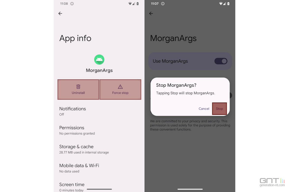 Pour compliquer sa suppression, le malware utilise des superpositions invisibles sur les boutons » Désinstaller » ou » Forcer l’arrêt « .