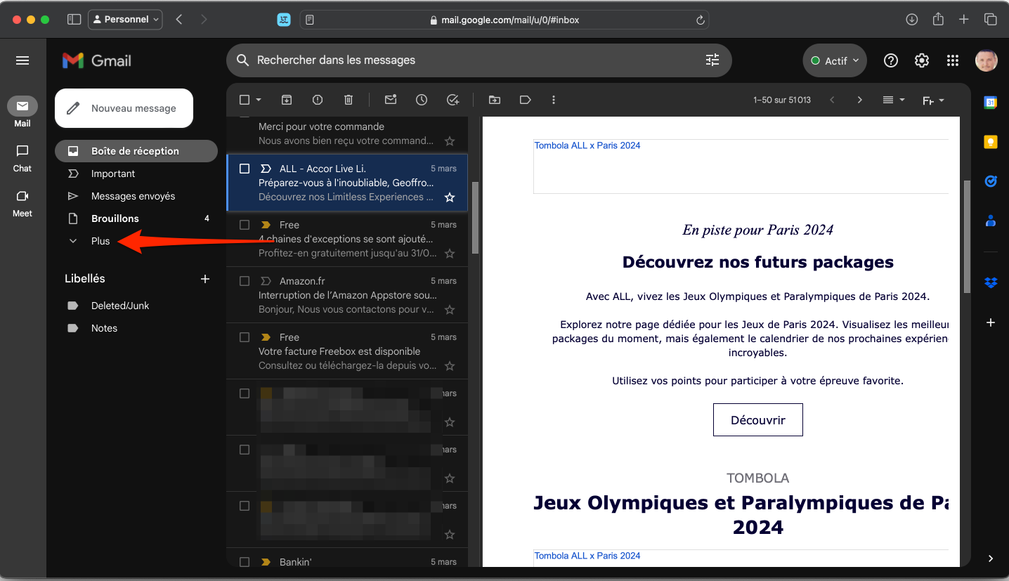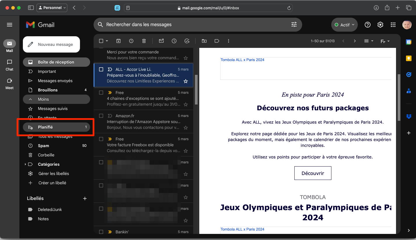 Si vous avez oublié un détail dans votre message, ou que vous souhaitez tout simplement décaler son envoi, pas de panique. Dans la colonne de gauche de Gmail, cliquez sur Plus pour accéder aux autres éléments de votre boîte, puis entrez dans la section Planifié.