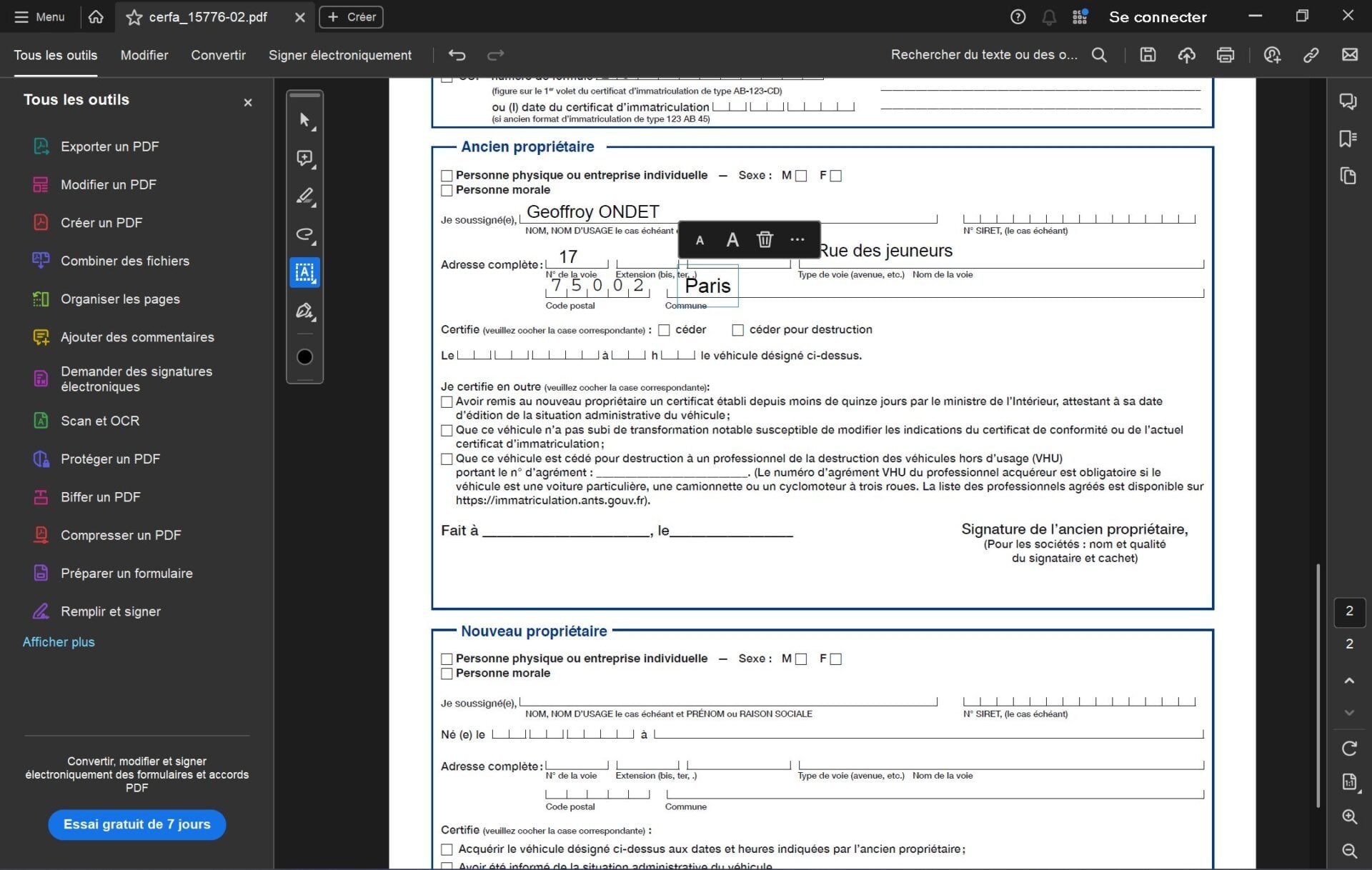 Maintenant que votre document est correctement rempli, voici venu le moment de le signer, et peut-être même de le parapher. Pour cela, cliquez sur l’icône figurant une signature affichée dans la barre d’outils, puis sur Créer une signature.