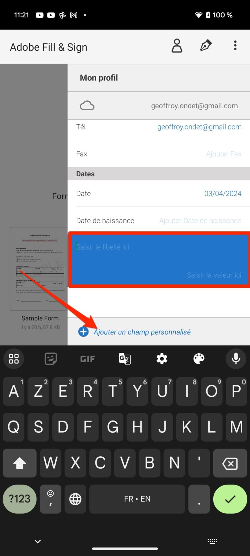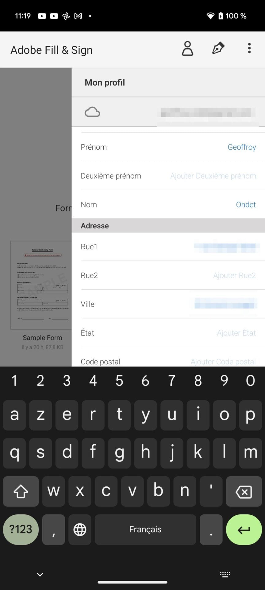 Une fois connecté à votre compte Adobe dans l’application, il vous faut remplir les informations de votre profil afin que celles-ci puissent être utilisés par le module de remplissage automatique. Pour se faire, appuyez sur l’icône figurant une silhouette en haut à droite de l’écran. Un volet Mon profil devrait alors s’afficher. Remplissez chaque champ proposé avec vos informations personnelles. Dans le cas où vous souhaiteriez ajouter un champ qui n’est pas proposé par l’application, appuyer sur Ajouter un champ personnalisé en bas de l’écran, choisissez un libellé et renseignez les informations du champ.
