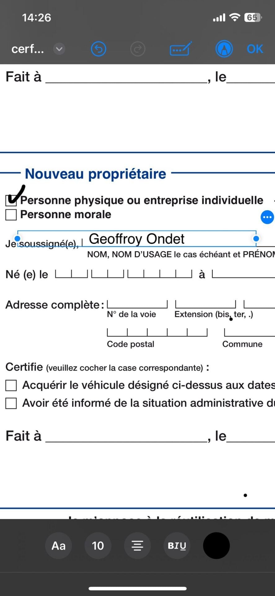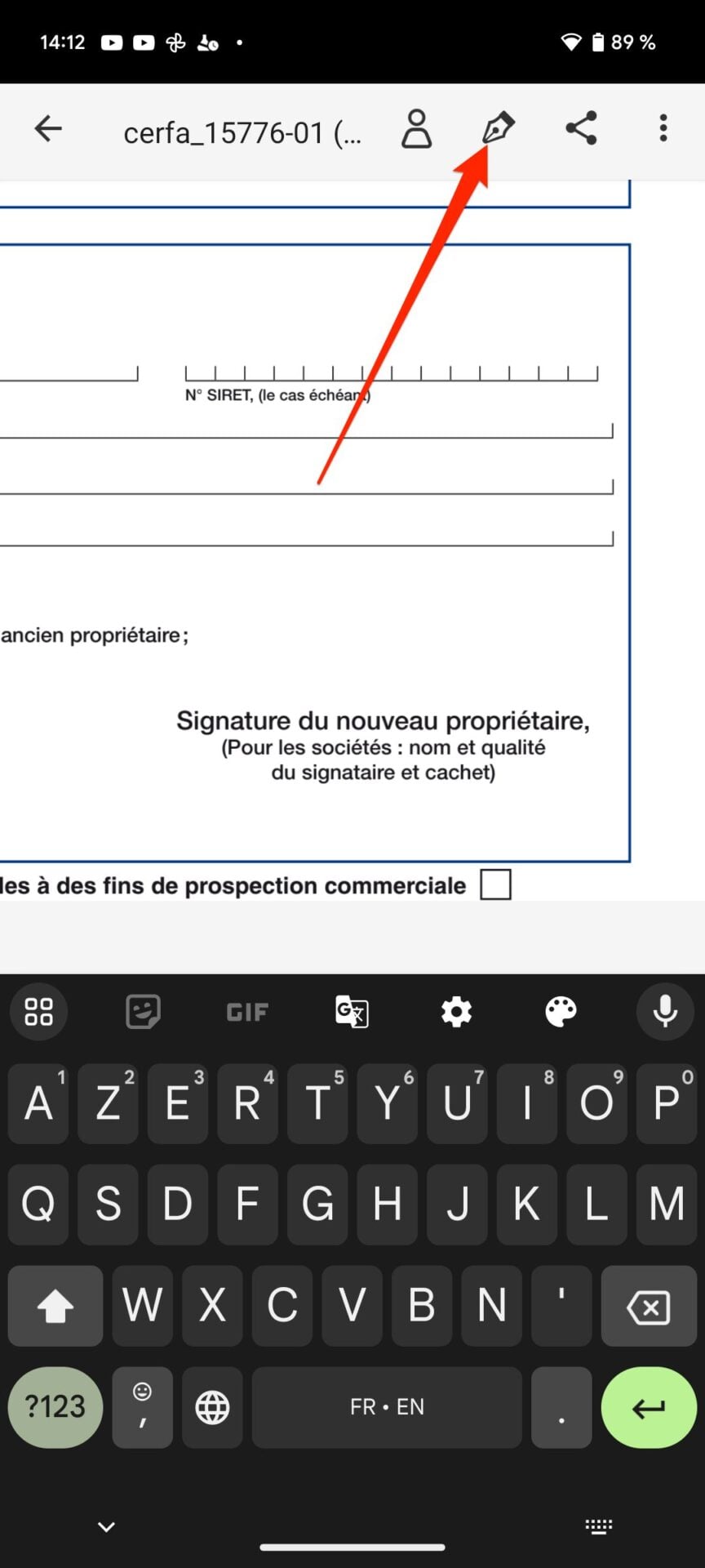 Le crayon est l’outil d’annotation sélectionné par défaut. Par conséquent, si vous faites glisser un doigt sur le document, vous écrirez sur celui-ci. Vous pouvez annuler facilement une manipulation accidentelle en sélectionnant le bouton retour arrière affiché en haut de l’écran. Vous pourrez utiliser l’outil crayon pour cocher, par exemple, les cases affichées sur votre document. En revanche, pour remplir les champs du document, deux options s’offrent à vous. Vous pouvez, au choix, utiliser le module de remplissage automatique (troisième icône en partant de la droite en haut de l’écran), ou ajouter du texte manuellement.