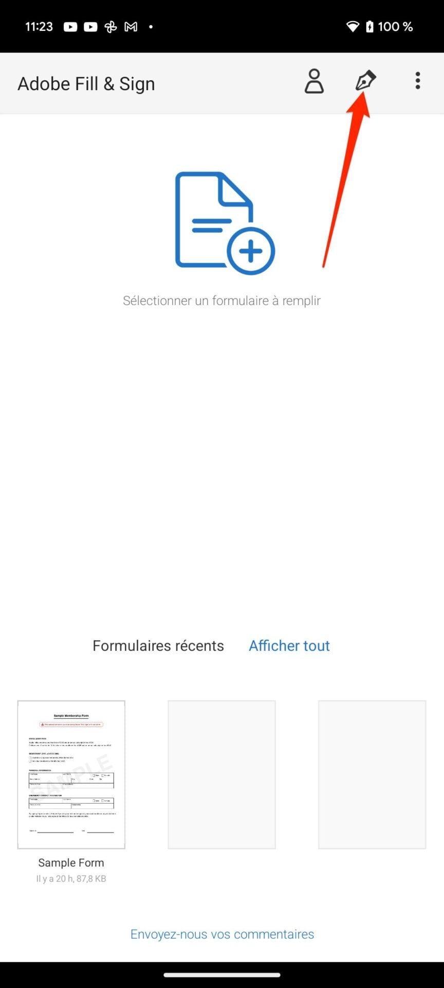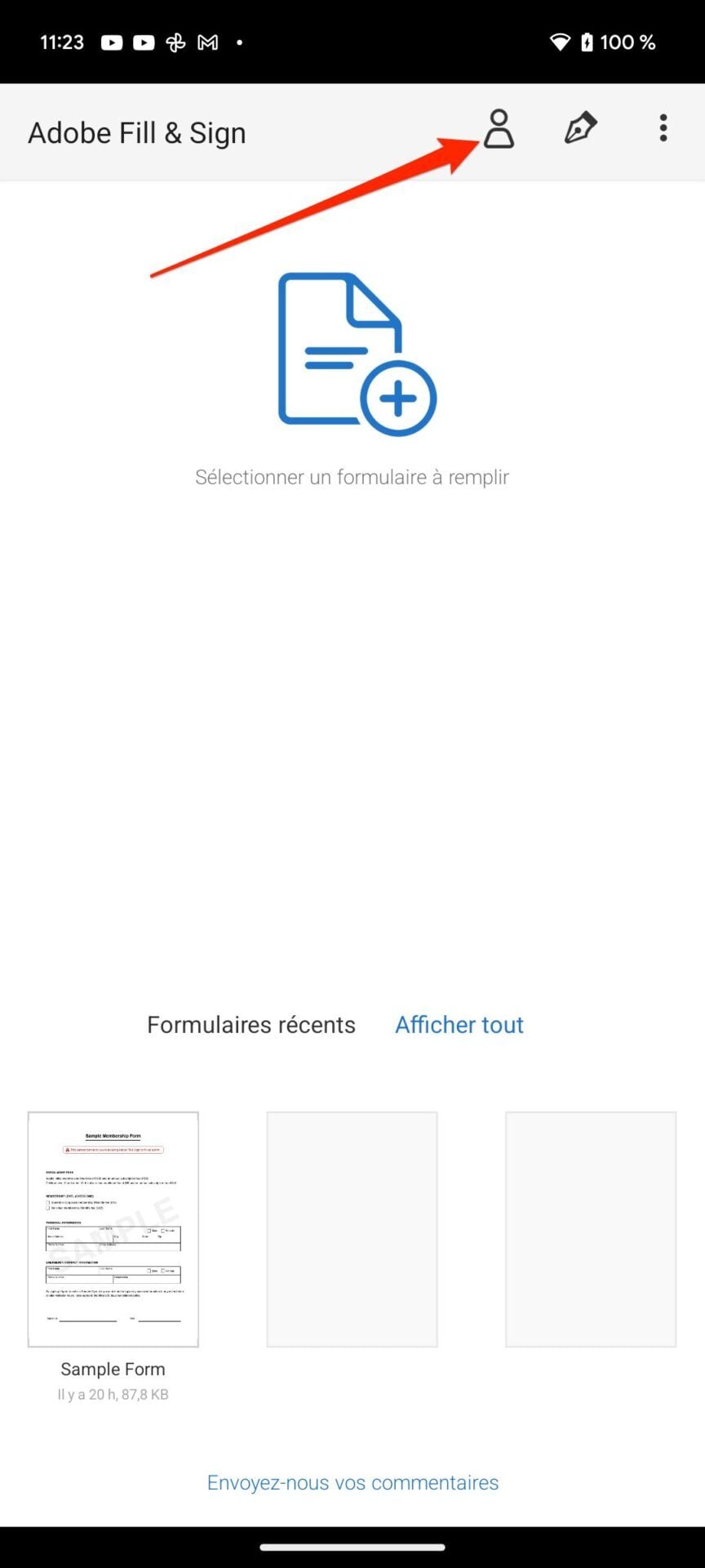 Commencez par télécharger l’application Remplissage et signature Adobe (Adobe Fill and Sign) sur votre smartphone Android. Cette application vous permettra de remplir et de signer aisément tous vos documents PDF directement depuis votre smartphone. Bien que gratuite, cette application nécessite que vous vous connectiez à votre compte Adobe pour synchroniser vos formulaires et autres signatures.