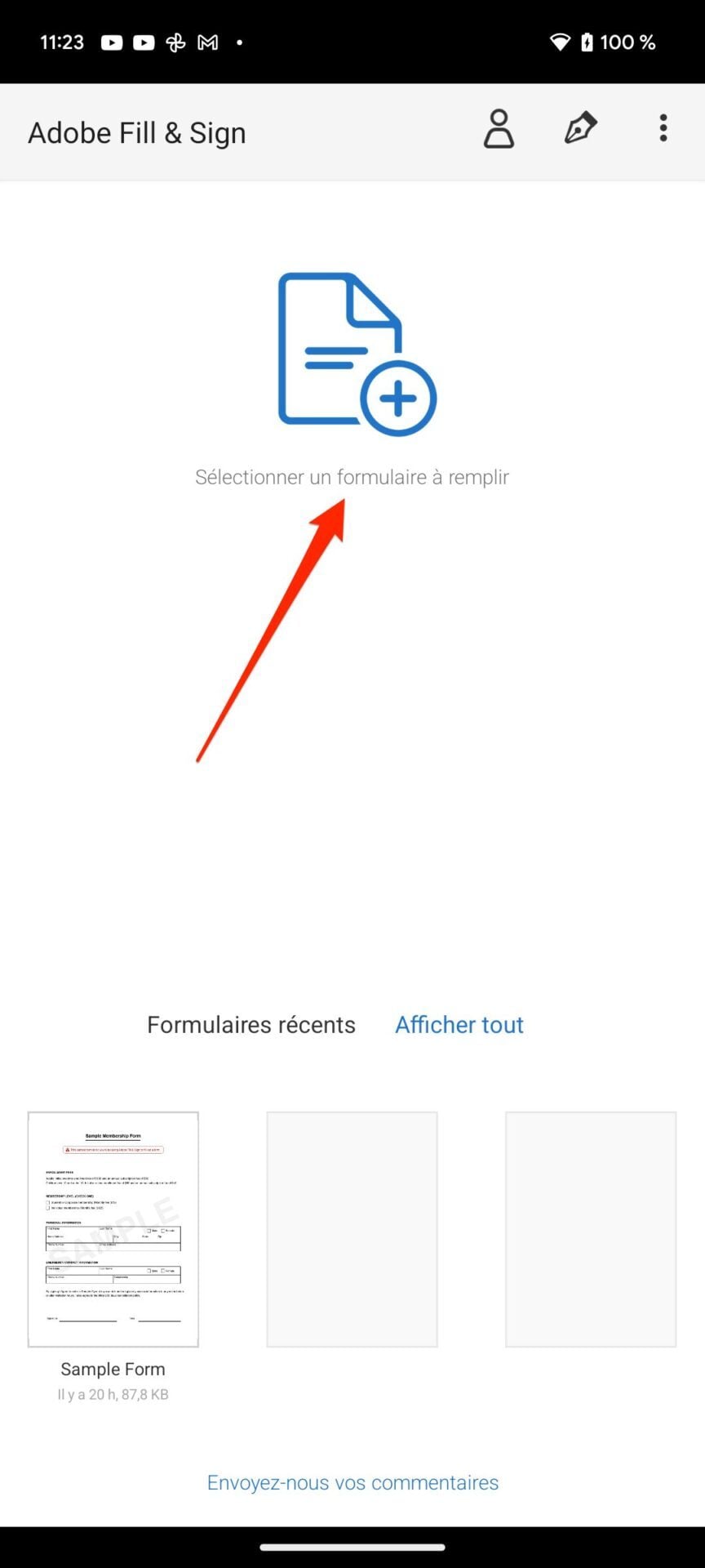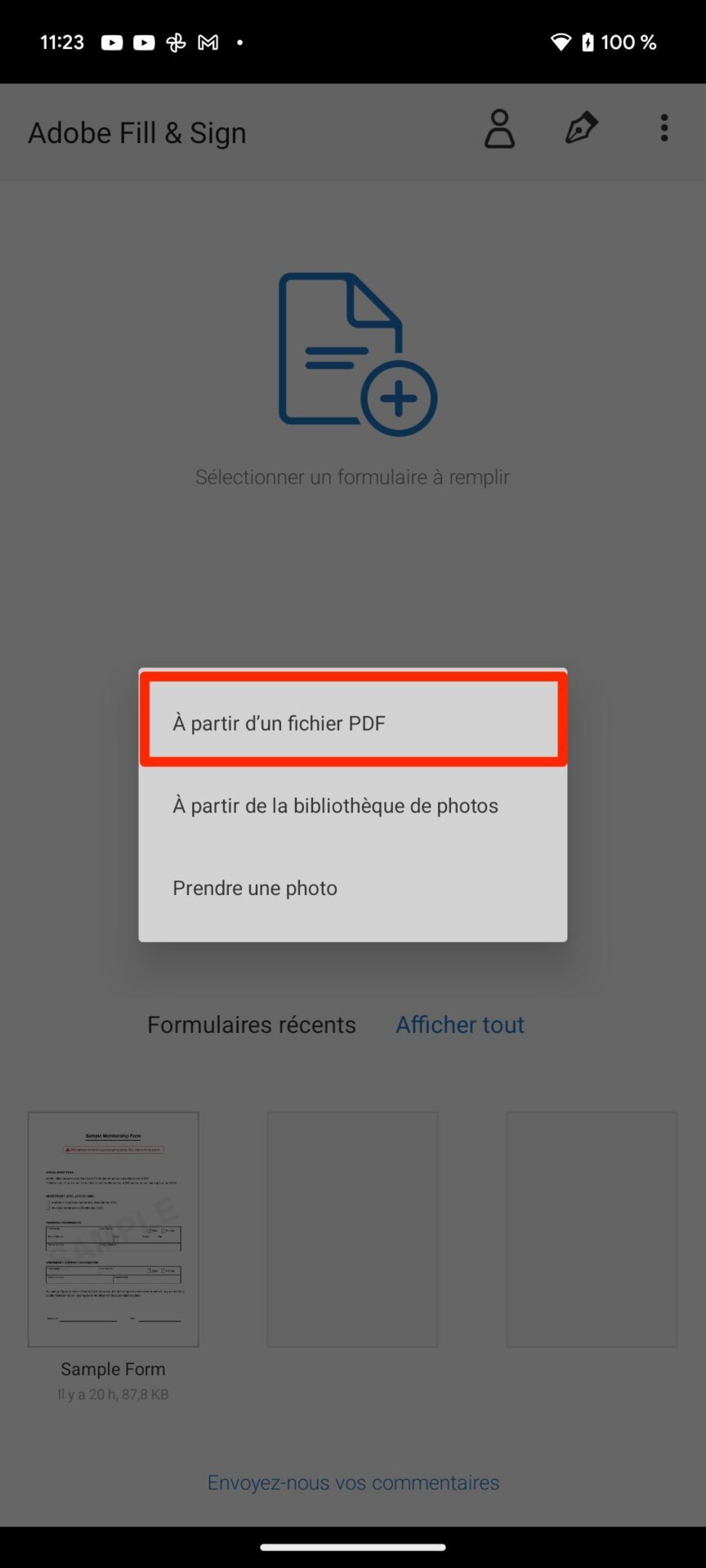 Pour ouvrir votre PDF préalablement téléchargé sur le stockage de votre smartphone, appuyez Sélectionner un formulaire à remplir, puis sur À partir d’un fichier PDF.
