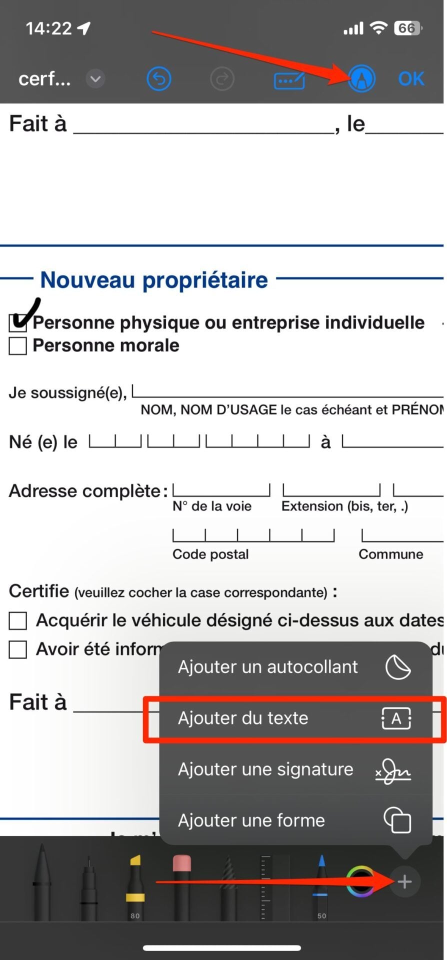 Pour ce faire, appuyez sur le bouton + en bas à droite, et choisissez Ajouter du texte. Un encadré de texte libre s’affiche alors. Vous pouvez l’agrandir ou le réduire, mais aussi modifier la taille de la police d’écriture à l’aide des outils affichés en bas de l’écran lorsqu’il est sélectionné. Appuyez ensuite dans l’encart de texte et renseignez vos informations. Recommencez l’opération pour chacun des champs à remplir.