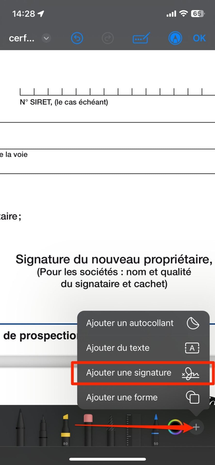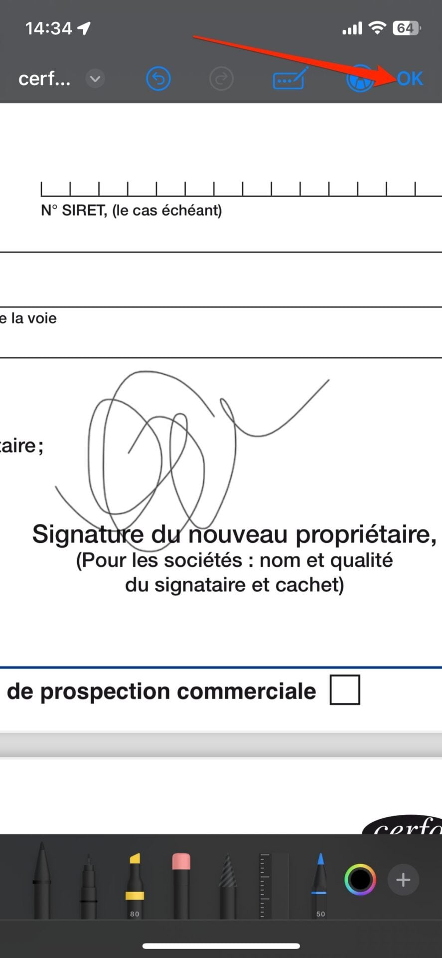 Voici venu le moment de signer votre document PDF dûment rempli. Pour cela, appuyez sur le bouton + en bas à droite, puis sélectionnez Ajouter une signature. A l’aide de votre doigt, dessinez votre signature sur l’écran qui vient de s’ouvrir et appuyez sur le bouton OK. Votre signature est automatiquement ajoutée à votre document. Vous pourrez sélectionner celle-ci pour la déplacer ou encore pour l’agrandir, en écartant l’encadré à l’aide de deux doigts. Appuyez ensuite sur le bouton OK en haut à droite et sélectionnez l’action à réaliser. Vous pourrez partager directement le document, ou l’Enregistrer dans Fichiers pour le partager ultérieurement.