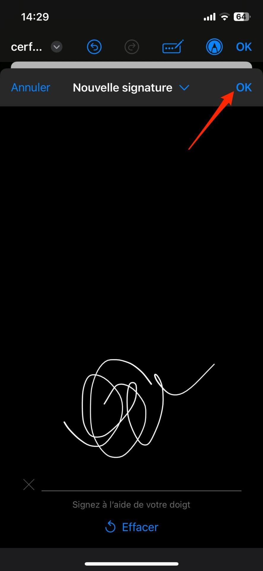 Enfin, la troisième et dernière option ne pourra être utilisée que si vous possédez un iPhone. Et pour cause, en sélectionnant l’option, l’écran de votre iPhone devrait automatiquement s’activer et afficher une zone sur laquelle vous pourrez dessiner votre signature au doigt. Cliquez ensuite sur Terminer pour l’enregistrer.