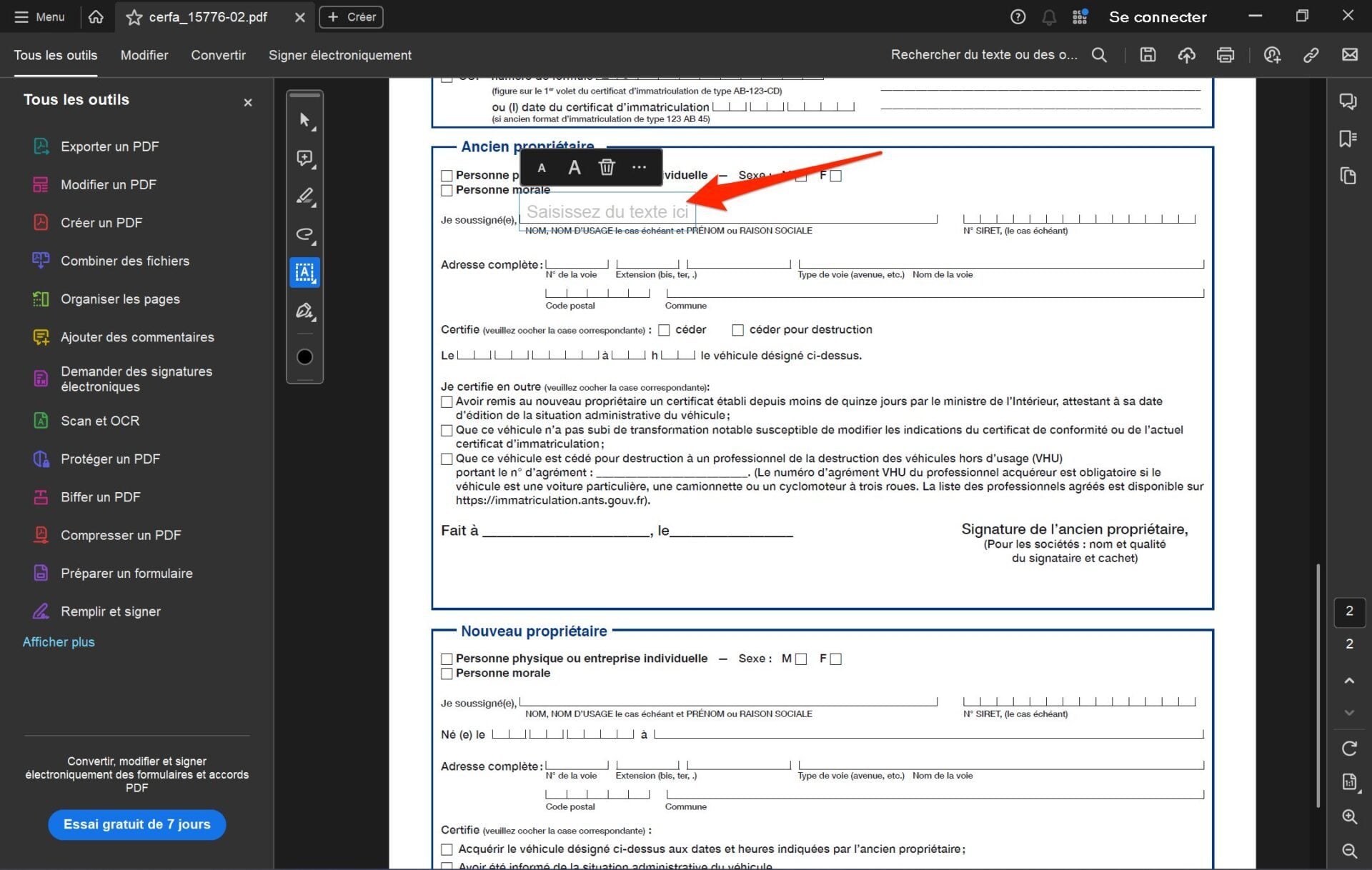 Votre document PDF est ouvert dans Acrobat Reader. Sur la gauche du document, un petit cartouche contenant plusieurs outils est affiché. Pour remplir votre document, sélectionnez l’avant-dernier outil figuré par un A entouré de pointillés, puis sélectionnez Saisie de texte.