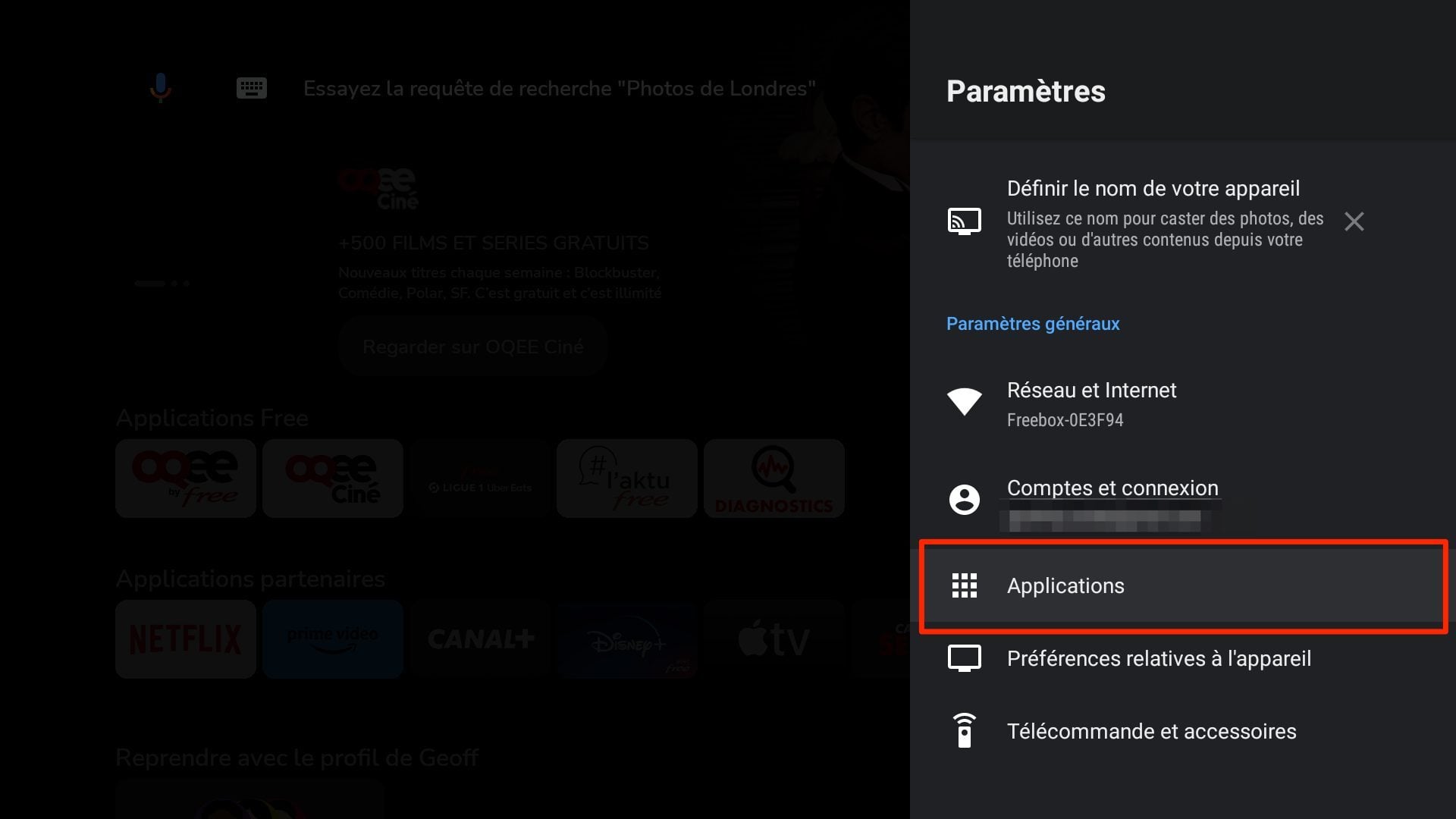 Pour autoriser RS File Manager à accéder au stockage du Player Freebox Pop, rendez-vous dans les Paramètres de celui-ci. Entrez ensuite dans Applications, puis sélectionnez RS File Manager.
