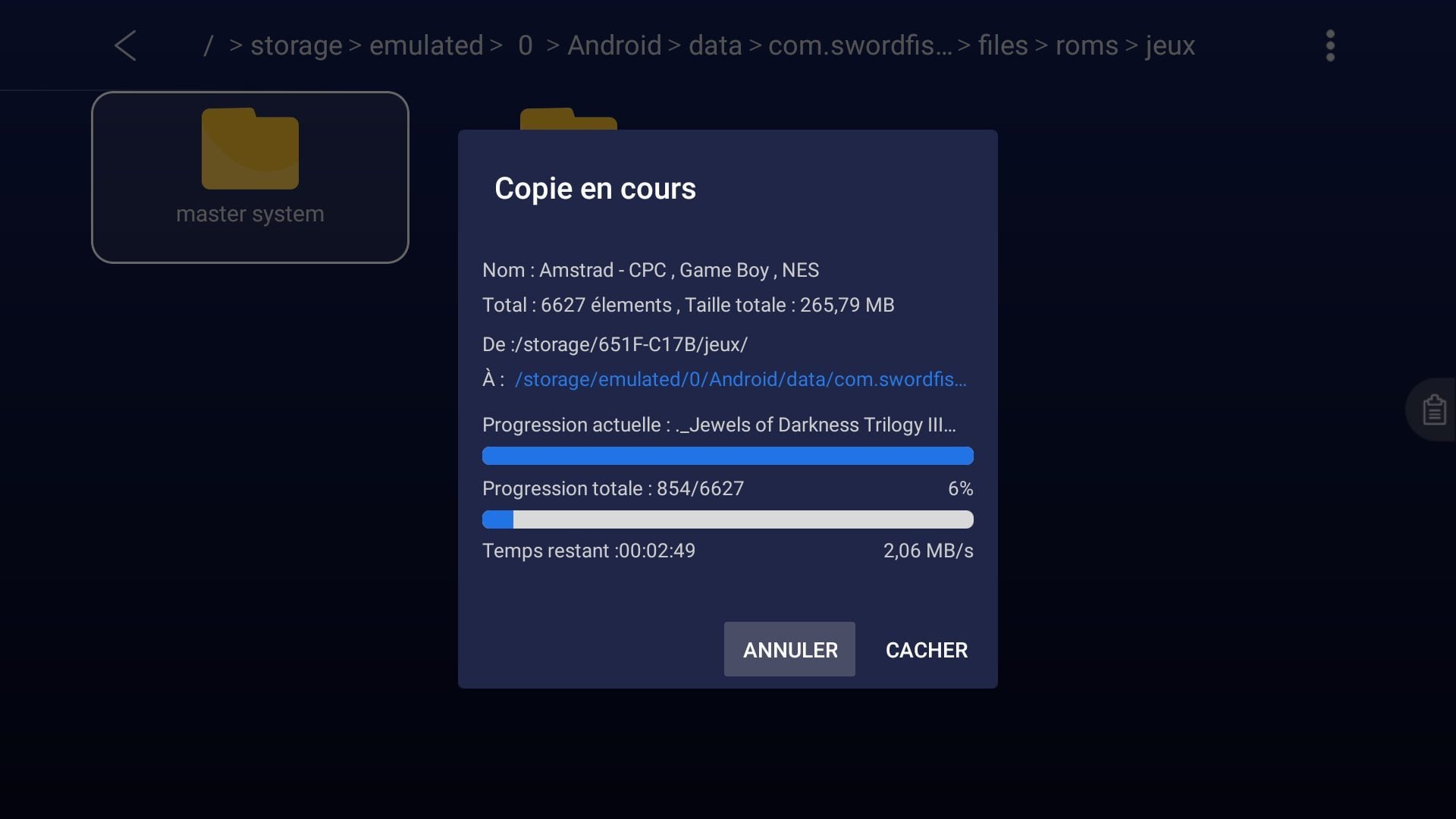 Collez à présent les éléments que vous avez précédemment copiés. Patientez quelques instants le temps que les fichiers soient copiés de votre support de stockage externe vers le dossier des ROMs de jeux de Lemuroid sur la mémoire interne de la box.