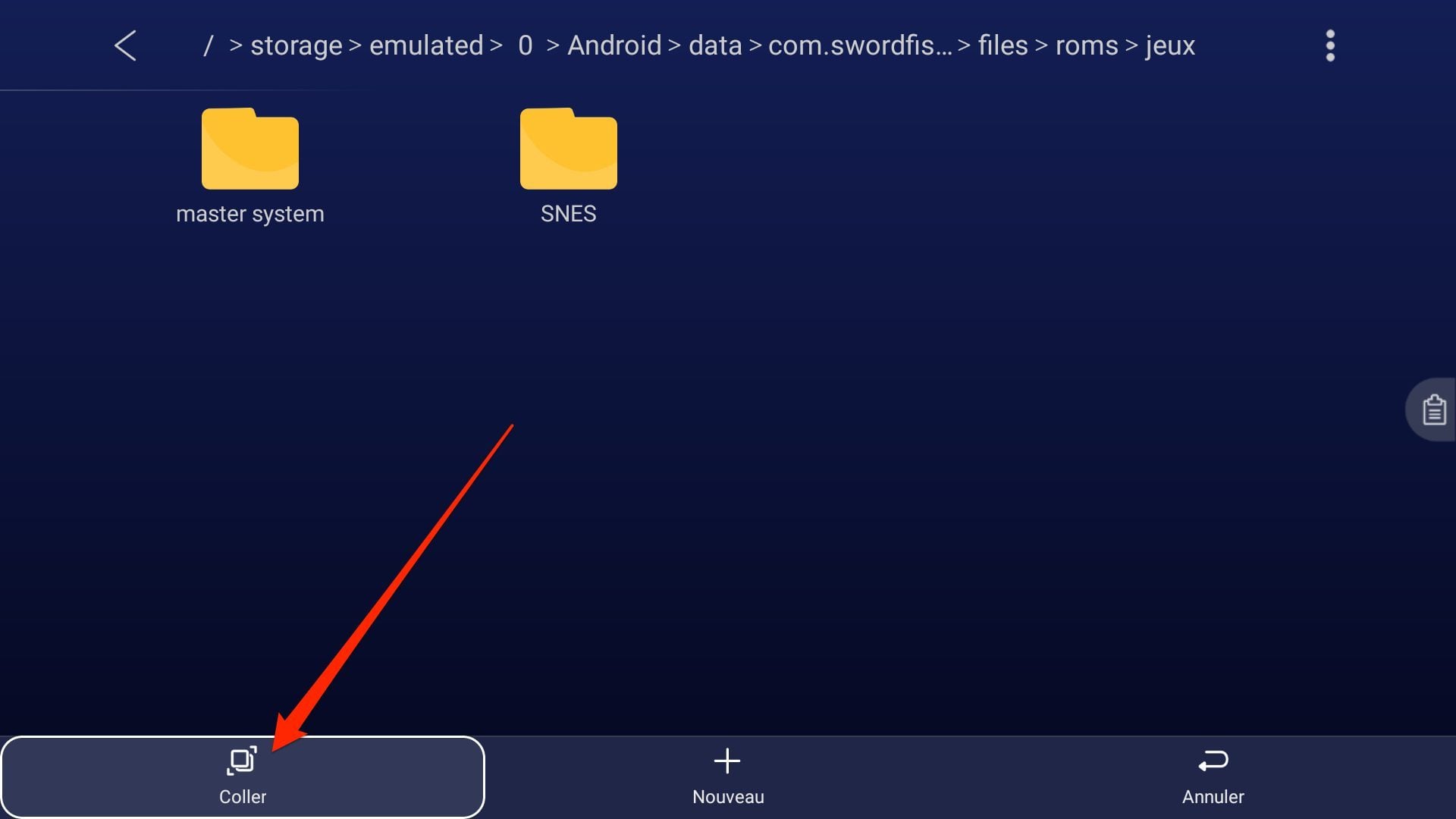 Accédez désormais à la mémoire de votre Player Freebox Pop et rendez-vous dans le répertoire storage/emulated/0/Android/data/com.swordfish.lemuroid/files/roms. Si vous avez opté pour RS File Manager sur le Player Freebox Pop, ce chemin d’accès devrait être sous la forme Stockage interne/Android/data/com.swordfish.lemuroid/files/roms.