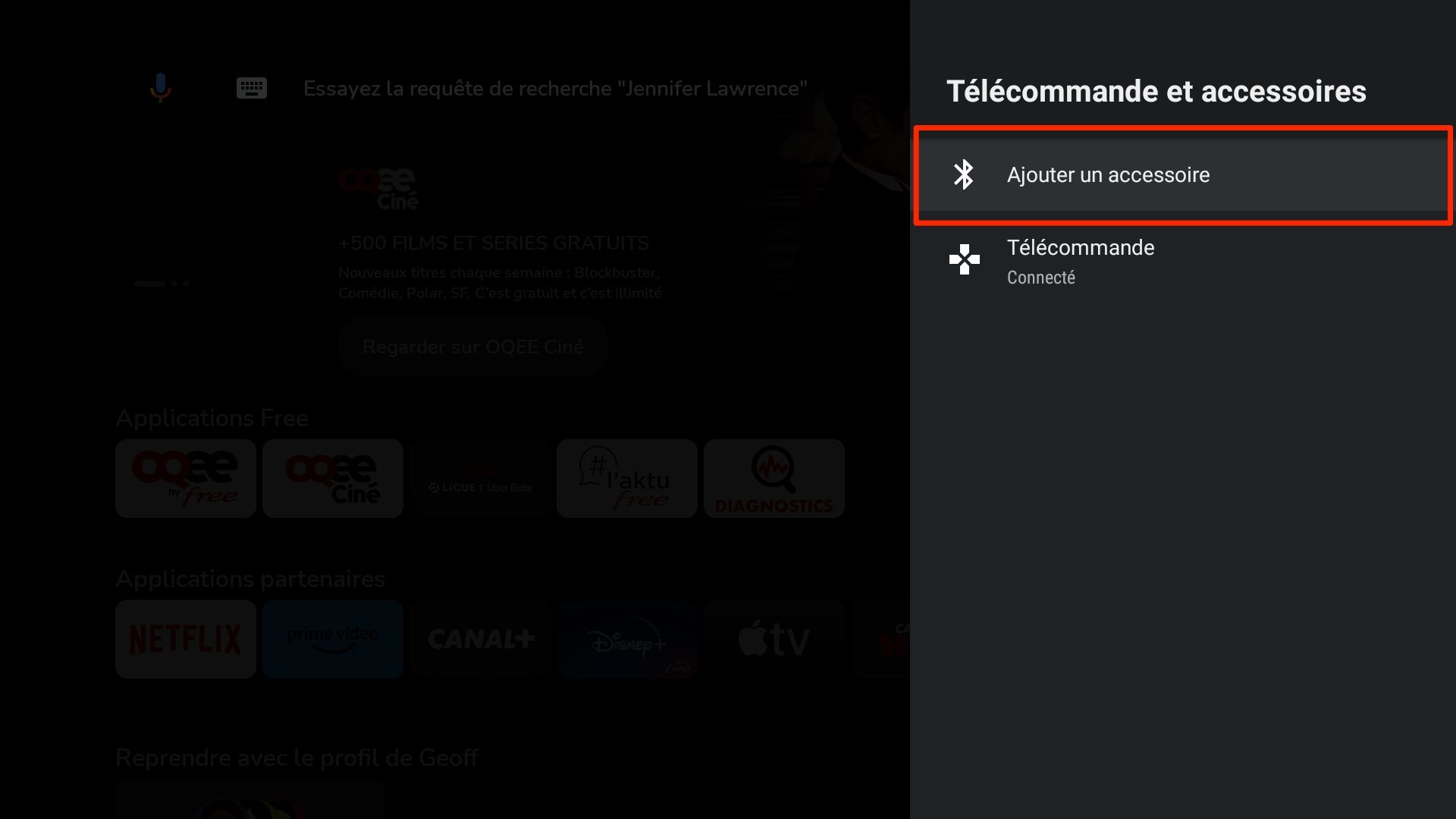 Choisissez à présent d’Ajouter un accessoire, et patientez un instant que le Player Freebox Pop détecte la manette. Appuyez sur le bouton de validation de la télécommande pour connecter la manette. À ce stade, vous devriez en principe pouvoir naviguer dans l’interface de votre Player Freebox Pop avec le contrôleur de votre console.
