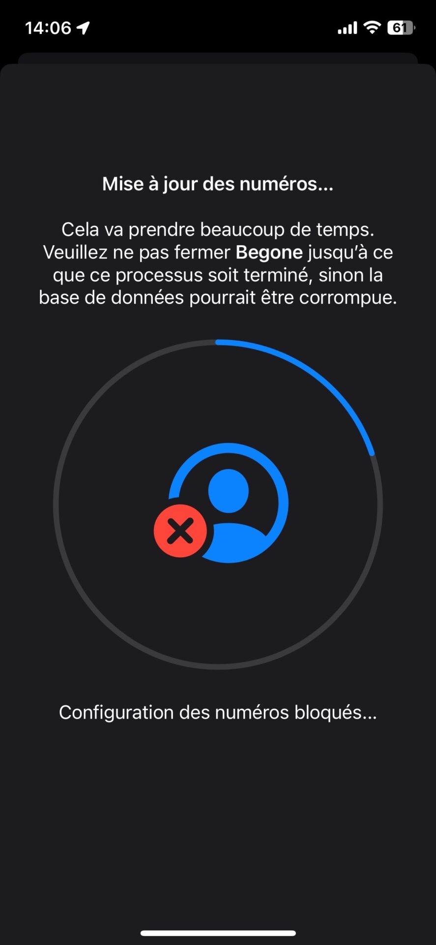 Concrètement, lorsque vous créez une liste noire, Begone crée localement sur votre iPhone une base de données regroupant l’ensemble des numéros à bloquer que vous lui avez indiqué. En bloquant simplement la plage de numéros commençant par le préfixe 0161 par exemple, vous vous apprêtez à bloquer 1 million de numéros. L’Arcep ayant mis en place une douzaine de préfixes pour la France métropolitaine, vous devriez vous retrouver à bloquer quelque 12 millions de numéros potentiellement indésirables sur votre appareil sans l’indicatif international. Et pas moins de 24 millions de numéros si vous incluez l’indicatif international dans votre liste de préfixes bloqués ! Cela signifie que Begone génère dans sa base de données stockée sur votre iPhone chacun de ces 24 millions de numéros de téléphones potentiellement indésirables. En plus du temps que cela peut prendre, une telle base de données risque de monopoliser une partie de l’espace sur le stockage de l’appareil. Après avoir contacté Kerem Erkan, son développeur, celui-ci nous a toutefois indiqué que son application pouvait bloquer jusqu’à 60 millions de numéros de téléphone, ce qui représentait environ 3 Go d’espace de stockage au total.