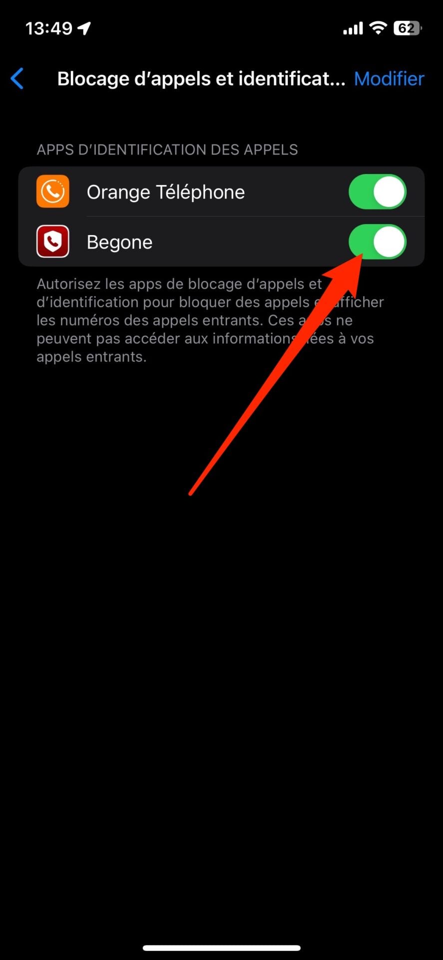 Pour que Begone puisse bloquer les appels indésirables sur votre iPhone, vous devez au préalable autoriser l’application dans les paramètres de l’application Téléphone. Pour ce faire, ouvrez les Réglages d’iOS, puis rendez-vous dans le menu Téléphone. Entrez ensuite dans Blocage d’appel et identification, puis activez Begone.