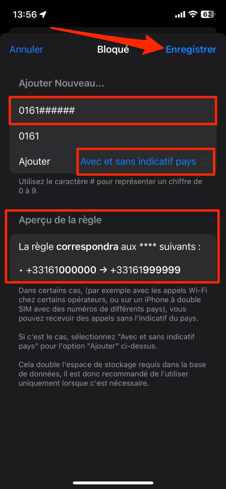 Le cadre aperçu de la règle devrait alors afficher automatiquement ce à quoi ressemble la règle de blocage de numéros que vous venez de mettre en place. Dans notre cas, avec la règle 0161###### (six fois le signe dièse représentant les six derniers chiffres de la plage de numéros commençant par 0161) correspond à un blocage de tous les numéros allant de +33161000000 à +33161999999.